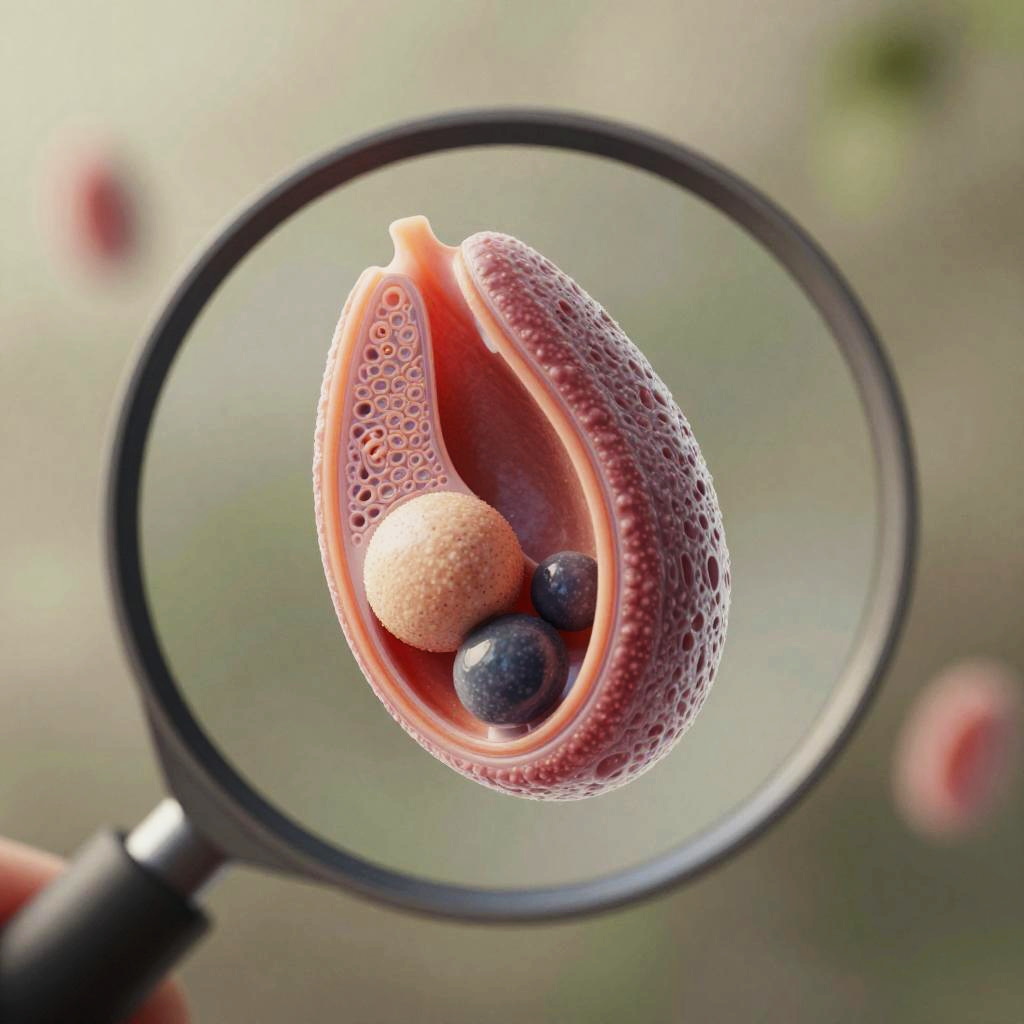 Bird testicles magnified in a detailed scientific illustration, showcasing vibrant textures and anatomy, set against a soft blurred natural background with subtle lighting emphasizing the intricate structures for educational purposes.