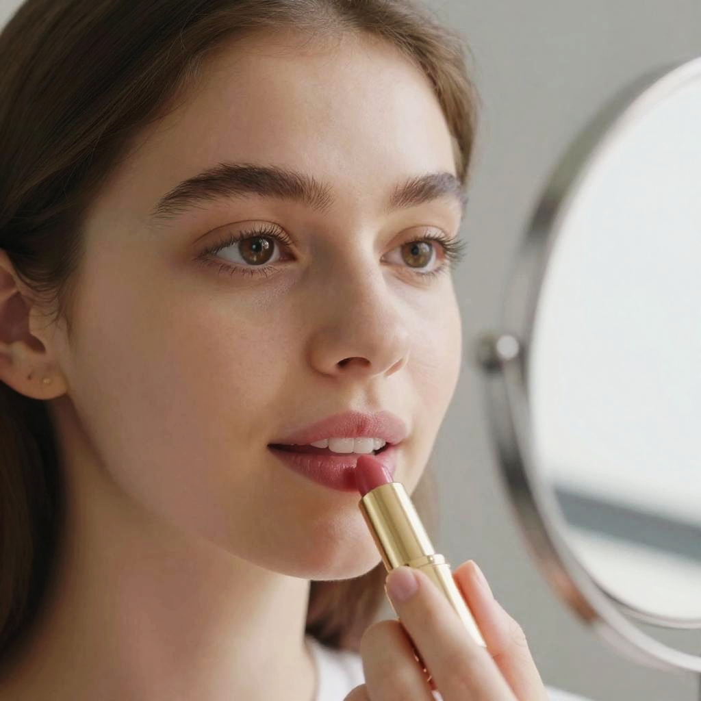 Photograph of a young woman with light brown hair, fair skin, and brown eyes, applying makeup with a black eyeliner brush to her right eyelid. She's looking slightly downward with a subtle smile, revealing white teeth. Her right hand holds the brush, while her left arm is partially visible. The background is a bright, white blur, and a round mirror is on the left side of the frame.