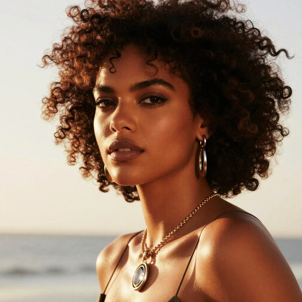 Close-up of Adriana Lima with natural textured afro hair, radiant dark complexion, elegant jewelry, soft golden hour lighting, capturing powerful and serene expression, contemporary style
