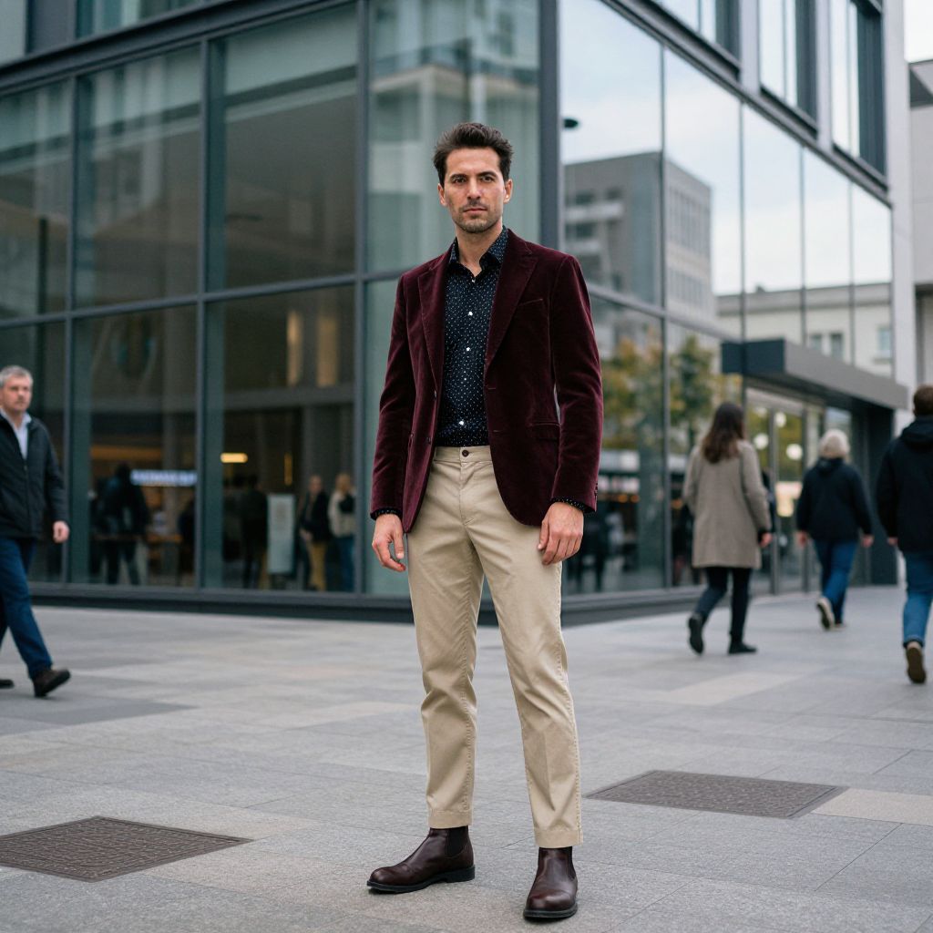 "a man, maroon velvet blazer, patterned black dress shirt, slim fit beige chinos, dark brown Chelsea boots, modern glass facade, reflective windows, busy street corner, chromogenic film, confident expression. Man has masculine face and piercing eyes"