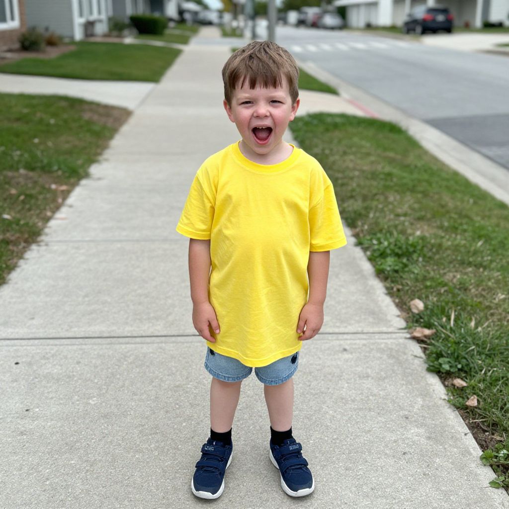 Photograph of a smiling, young boy in a bright yellow t-shirt, blue denim shorts, and black sneakers, standing on a suburban sidewalk.