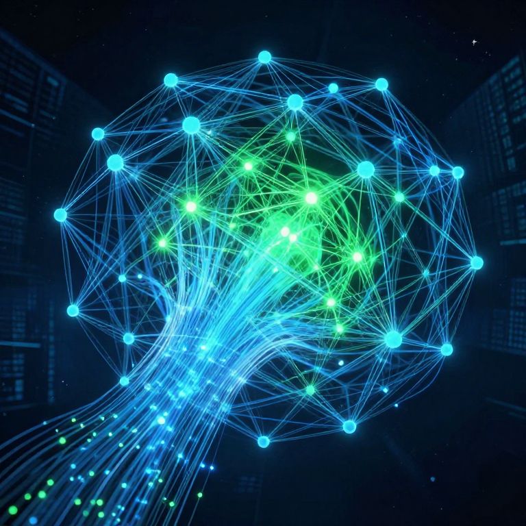 Digital artwork depicting a luminous, spherical network of interconnected blue and green nodes against a dark, starry backdrop. The nodes are connected by glowing, white lines, creating a web-like structure that radiates from the center. The blue nodes are predominantly on the outer edges, while the green nodes cluster in the middle, forming a bright, neon-green core. The background features faint silhouettes of skyscrapers, adding a sense of urban context to the futuristic scene. The image has a vibrant, cybernetic aesthetic with a high-contrast color palette.