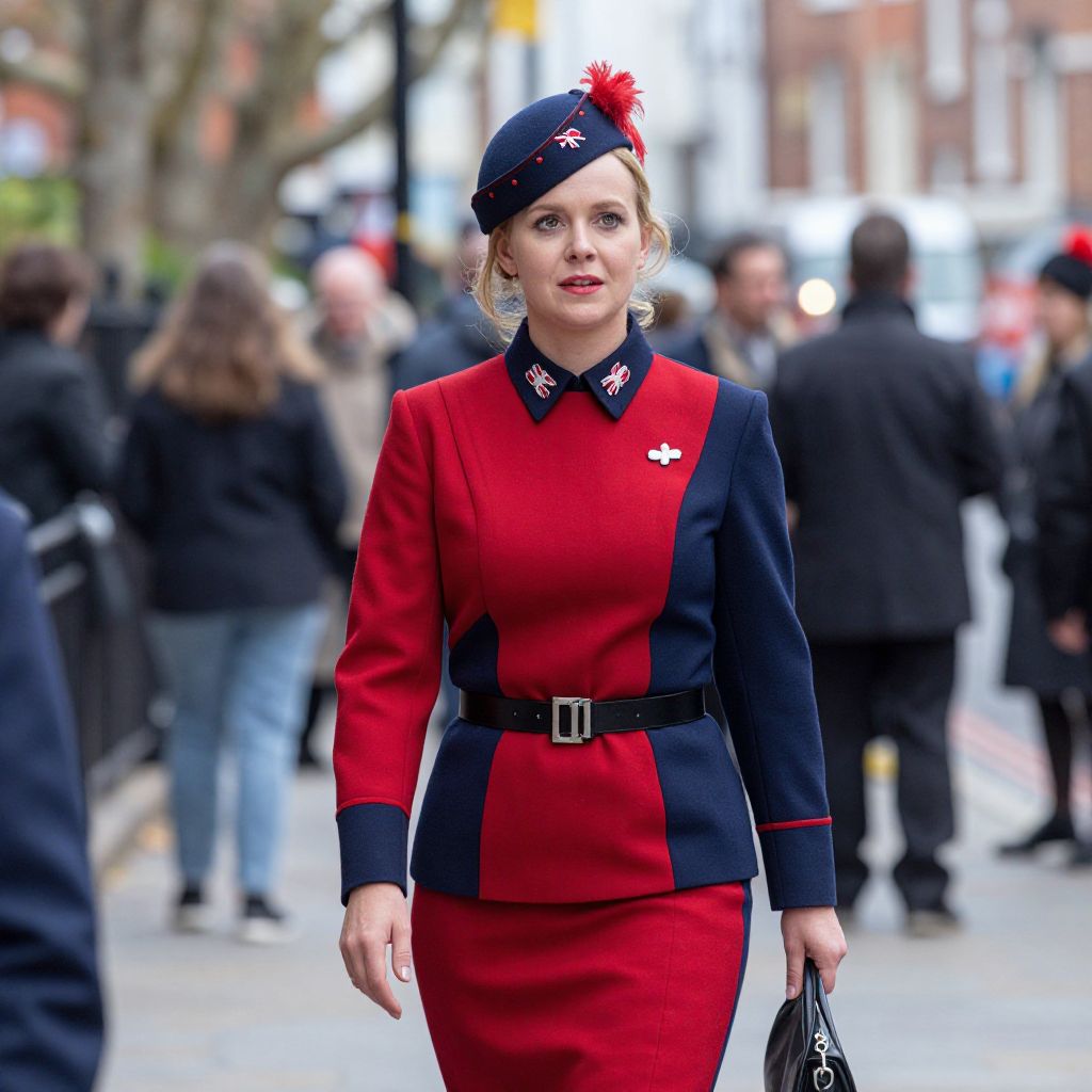 British Invasion, woman in red and blue uniform with hat and purse in street