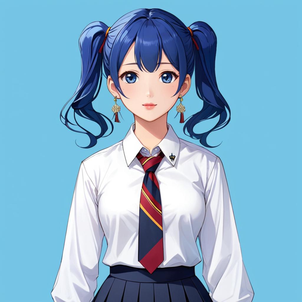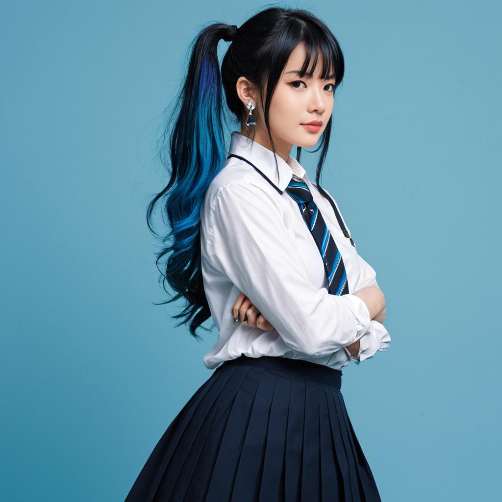 Photograph of an Asian woman with fair skin and long, wavy black hair with blue highlights, styled in a high ponytail. She is wearing a white, long-sleeved button-up shirt with a blue and black striped tie, and a high-waisted black pleated skirt. She stands with her arms crossed, looking over her shoulder with a slight smile. The background is a solid, bright blue. She has small, silver hoop earrings and wears subtle makeup. The image has a clean, modern, and slightly stylized aesthetic.
