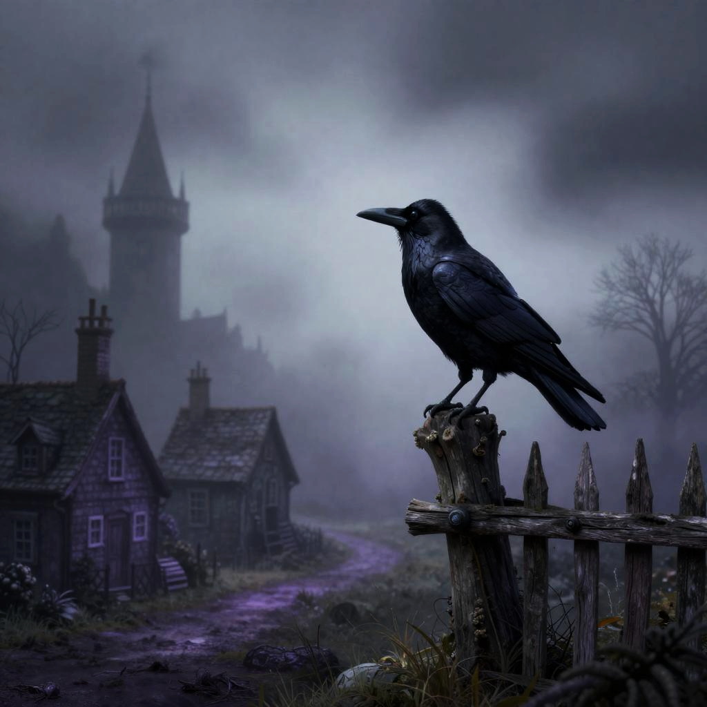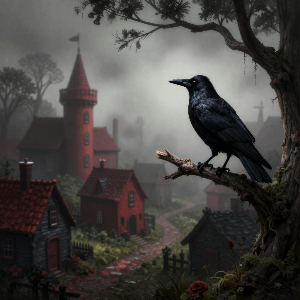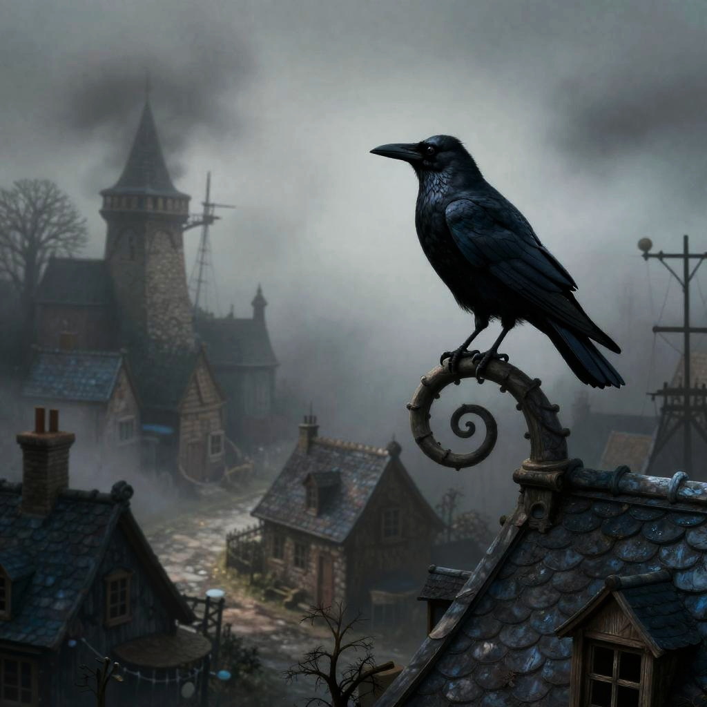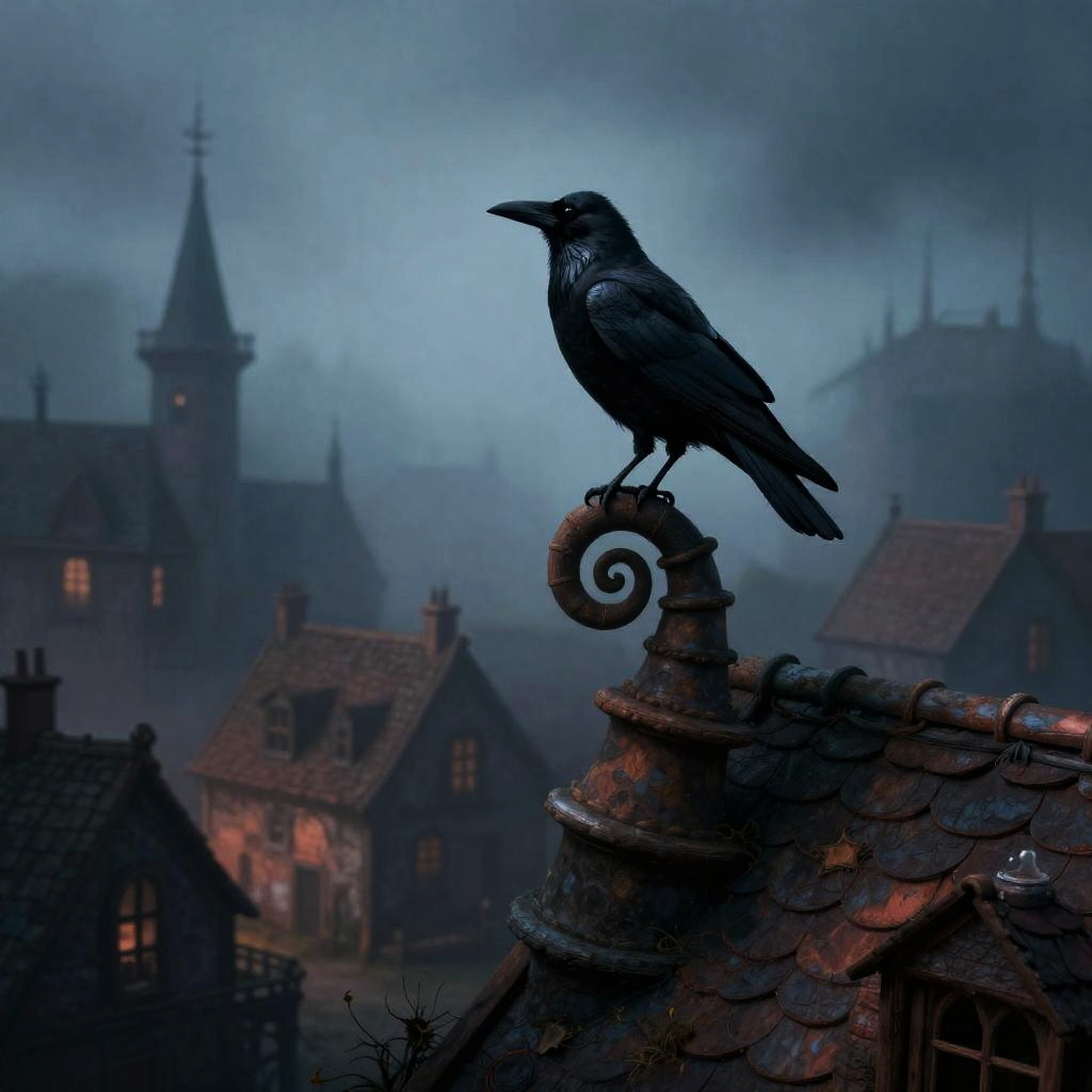 Whimsical art style inspired by Tim Burton, Edward Gorey depicting a somber crow perched on a spiraling rooftop, gazing down at a quaint but eerie village shrouded in fog, with dusky blues and burnt siennas giving a vintage aesthetic.