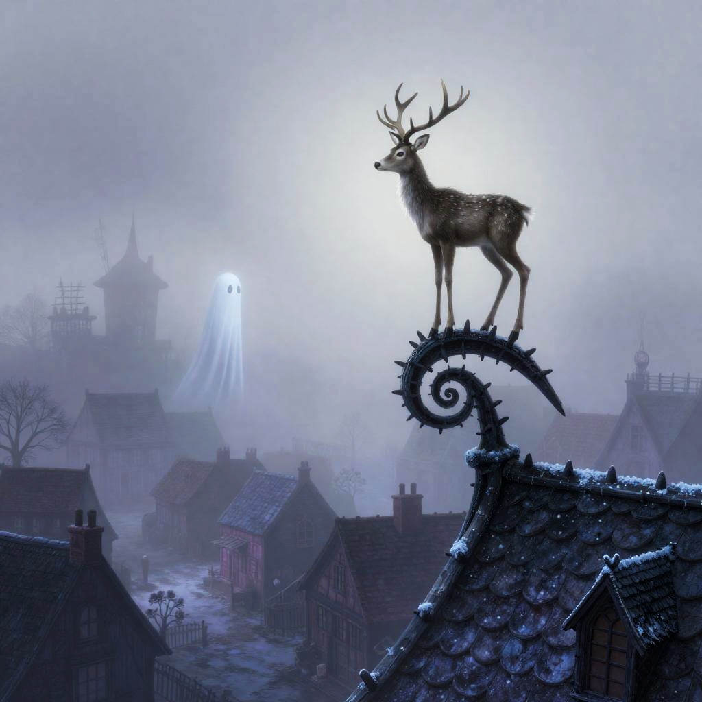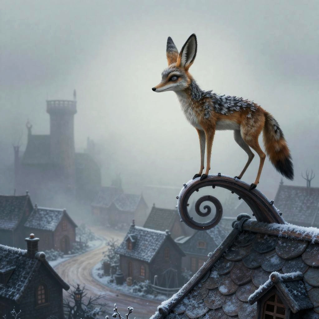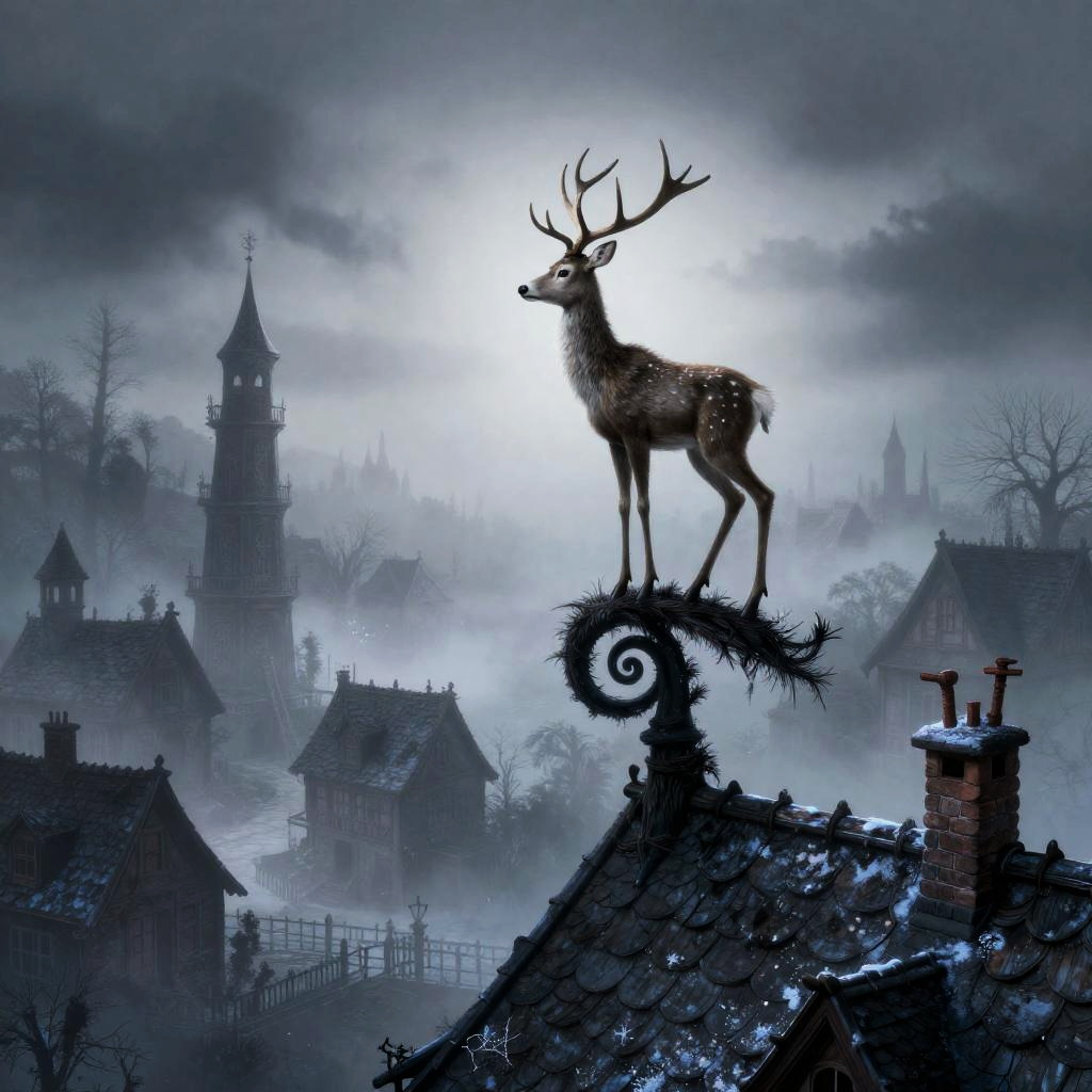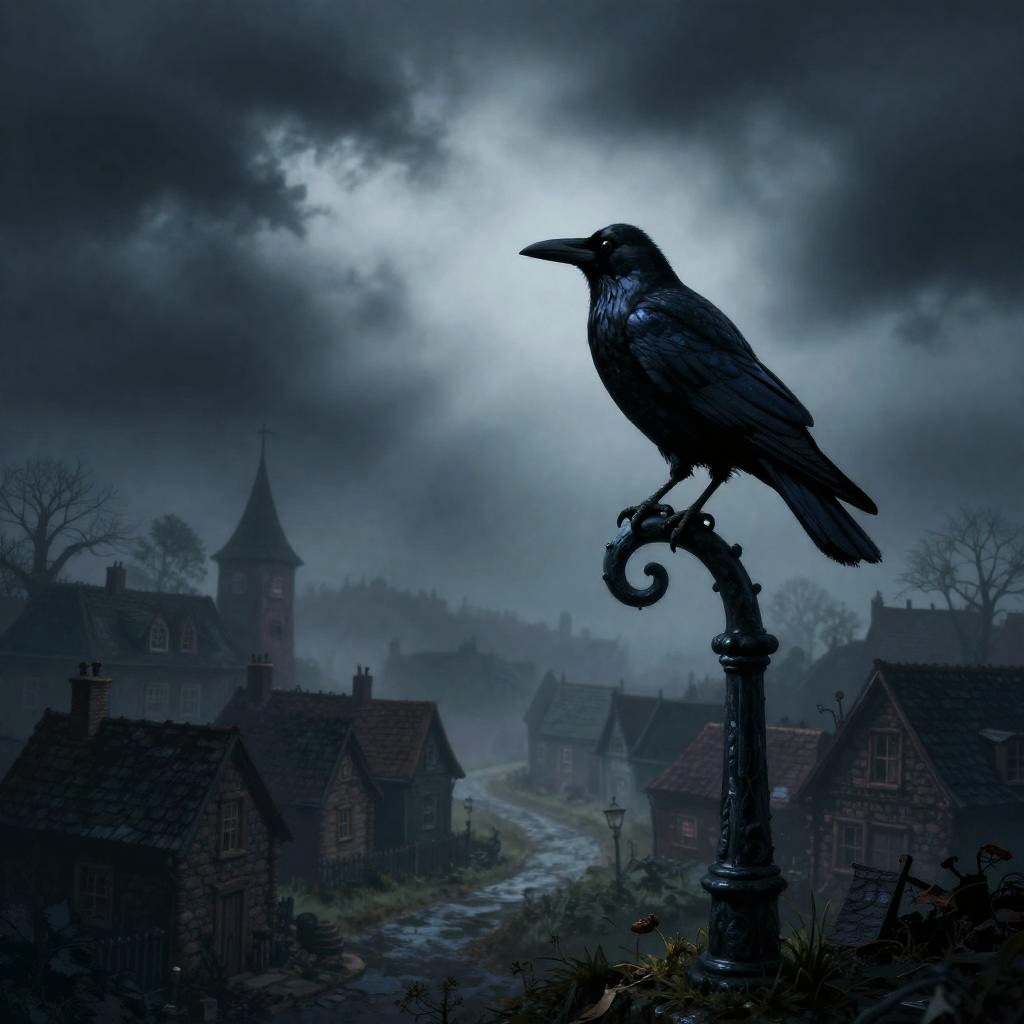 Whimsical art style inspired by Tim Burton, Edward Gorey depicting a somber crow perched on a spiraling rooftop, gazing down at a quaint but eerie village shrouded in fog, with dusky blues and burnt siennas giving a vintage aesthetic.