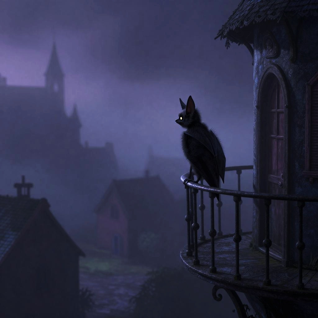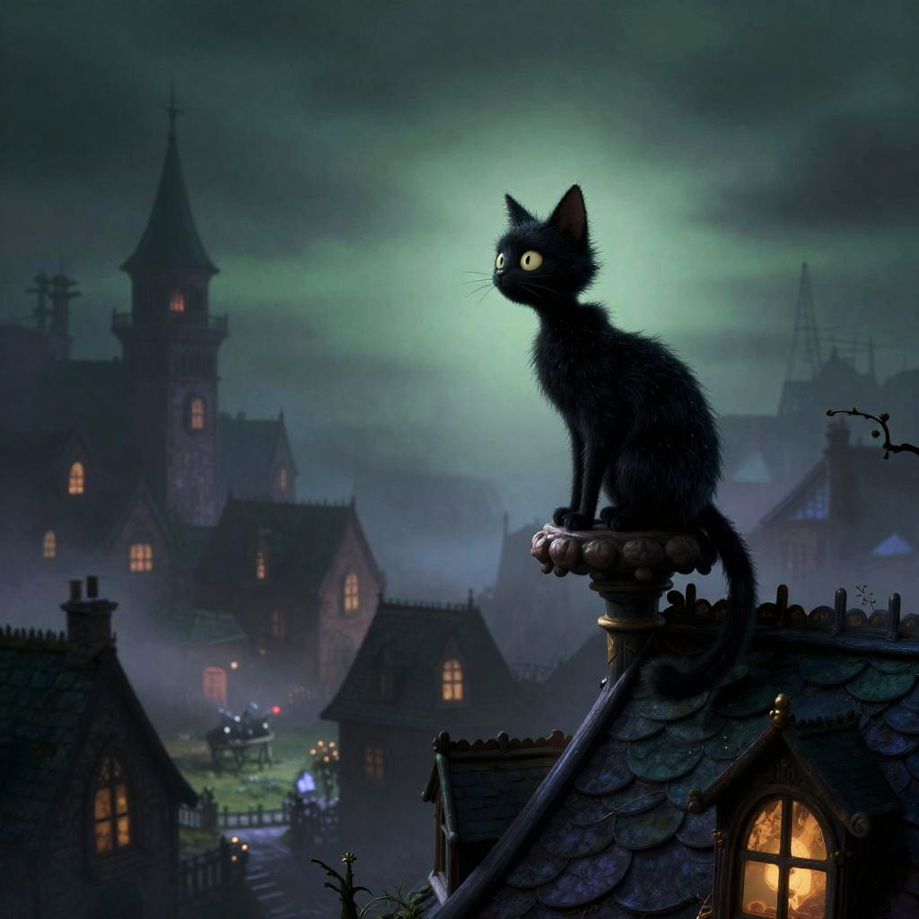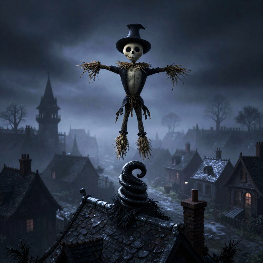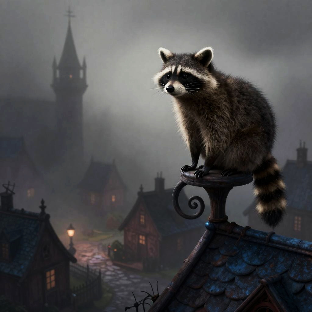 Whimsical art style inspired by Tim Burton, Edward Gorey depicting a somber crow perched on a spiraling rooftop, gazing down at a quaint but eerie village shrouded in fog, with dusky blues and burnt siennas giving a vintage aesthetic.