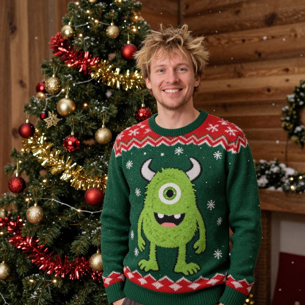 Photograph of a smiling, blonde-haired man with tousled hair, wearing a green Christmas sweater adorned with a large, green monster with white horns and a single eye, surrounded by white snowflakes and red patterns. He stands in front of a decorated Christmas tree with red and gold ornaments and tinsel. The background features wooden wall panels, adding a rustic feel. Snowflakes are visible in the air, enhancing the festive atmosphere. The man's casual, playful look contrasts with the traditional holiday decor, creating a whimsical and cheerful scene.