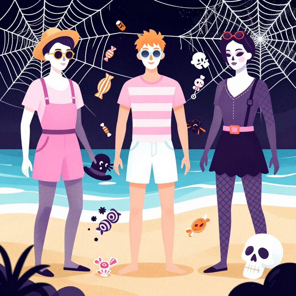 Digital illustration of three stylized, pale-skinned Halloween figures in beach setting, with spider webs, costumes, and spooky decorations.