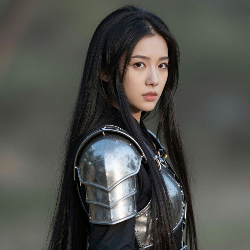 Long hair costume, 1girl, long hair, solo, black hair, lips, realistic, armor, looking at viewer