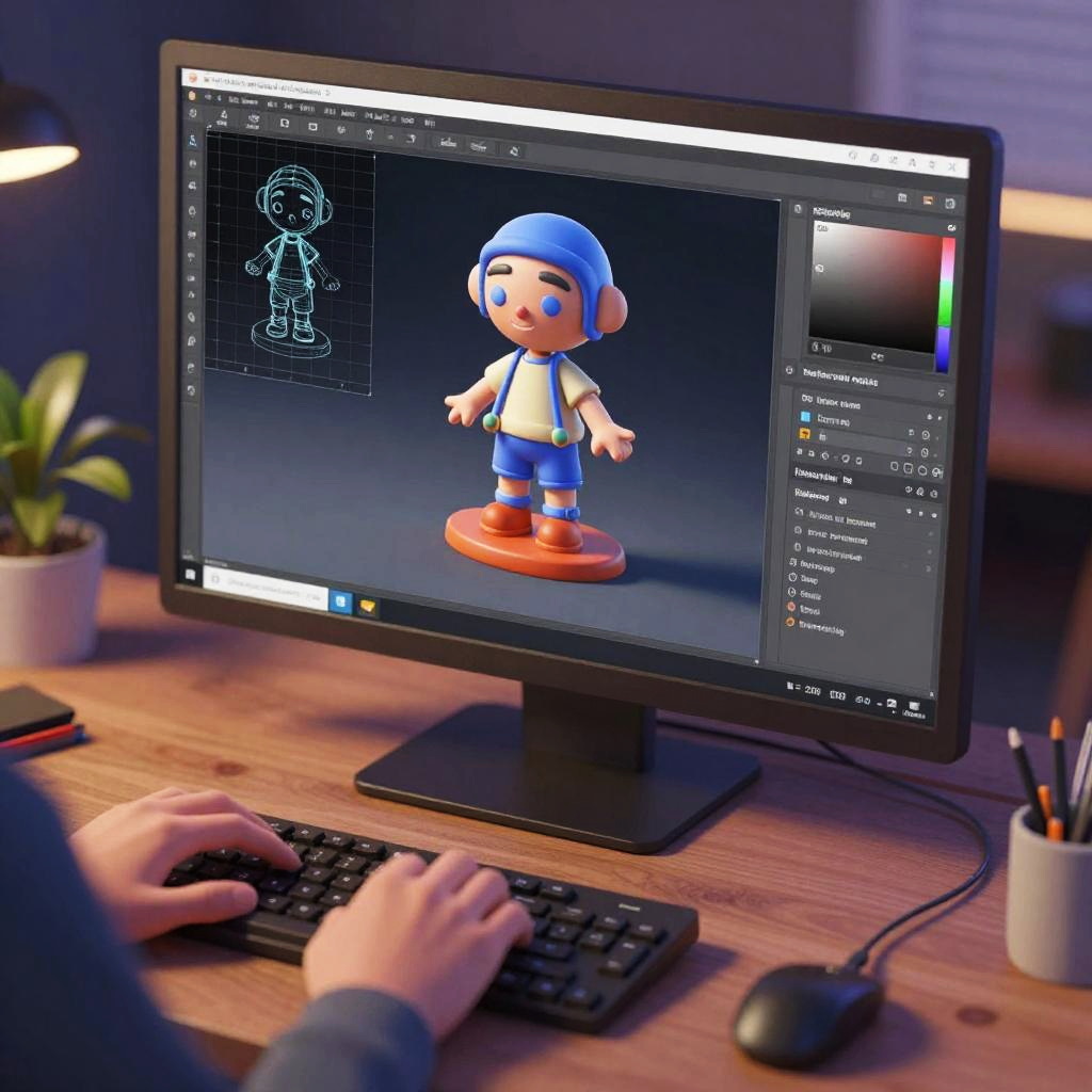 Sprite creator designing retro 8-bit video game characters on a high-resolution monitor, colorful pixel sprites emerging from a digital palette, old school gaming vibes, cozy workspace with vintage gaming posters, soft warm lighting, detailed pixel art style