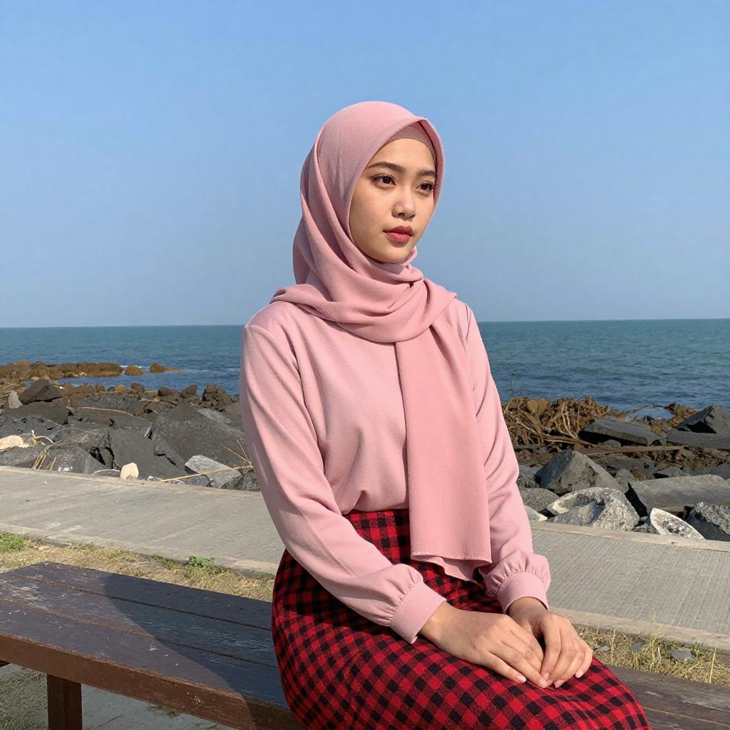 Photograph of an Asian woman with fair skin and red lipstick, wearing a brown hijab and long-sleeve, ribbed, brown top with white pants. She sits on a wooden bench at night, grassy field background with dimly lit outdoor furniture. Her hands rest on her lap, and she gazes directly at the camera.