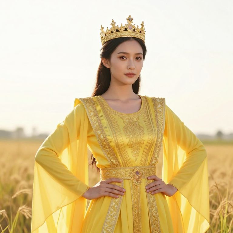 A person stands confidently in a vibrant yellow outfit, featuring flowing fabric and detailed patterns, wearing a shimmering gold crown on their head. The crown gleams under soft sunlight, adding a regal and majestic atmosphere. The person has a warm, expressive face with bright eyes, a calm yet powerful expression, and stands in a serene, open field with golden grass and a faintly glowing horizon, emphasizing their divine or noble presence.
