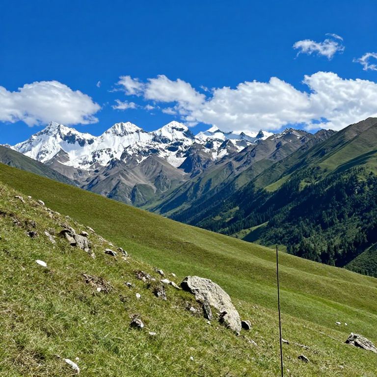 Photograph of a vibrant mountain landscape. The foreground features a grassy slope with scattered rocks, leading to a mid-ground of dense green forest. In the background, majestic snow-capped mountains rise against a brilliant blue sky with fluffy white clouds. A thin, dark pole is visible in the right foreground. The image captures the natural beauty and contrast between the green grass, dark forest, white snow, and blue sky. The texture of the grass and rocks is detailed, while the sky is smooth and bright.