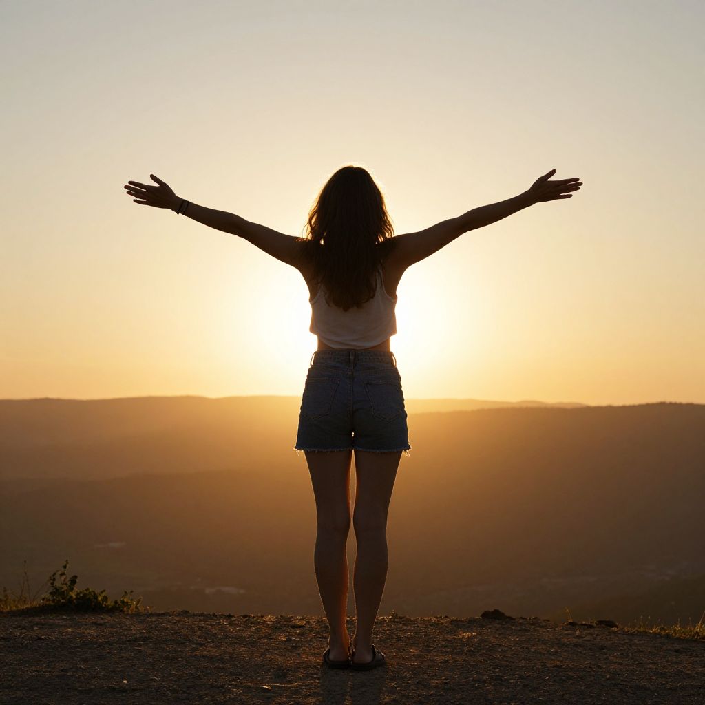 Photograph of a woman with long hair, wearing a white top and denim shorts, standing with arms outstretched, silhouetted against a