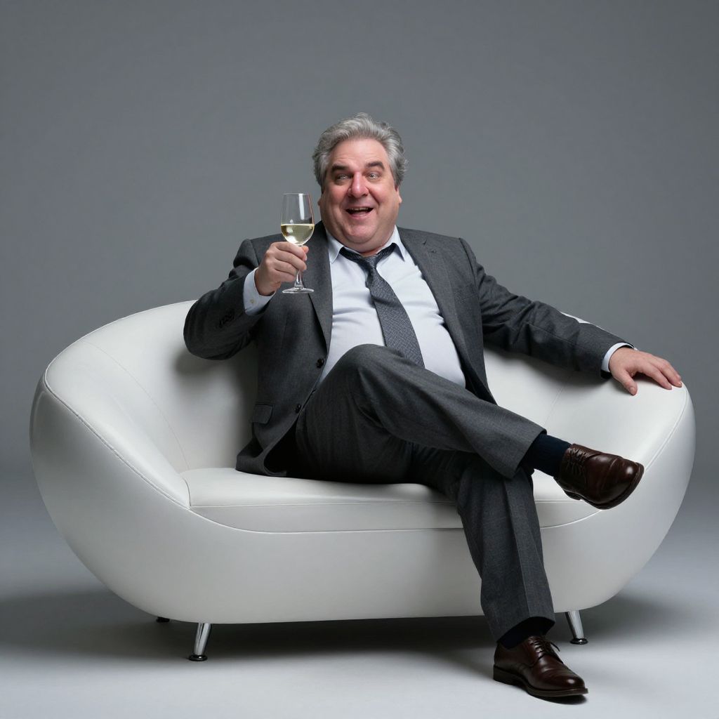 Photograph of a middle-aged man with gray hair, wearing a black suit, white shirt, and black tie, reclining on a modern, white, oval-shaped leather couch. He holds a champagne flute in his right hand, raised slightly, and has a relaxed, smiling expression. His left arm rests on the back of the couch, and his legs are crossed. The background is a simple, gradient gray, emphasizing the subject. The man's shoes are dark brown, and his suit is well-fitted, giving a formal yet casual appearance. The overall mood is elegant and celebratory.