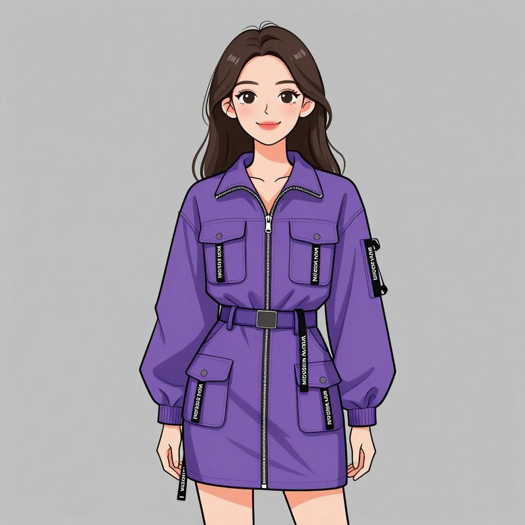 Woman with pretty face and pretty hair. smiling Woman, streetwear, purple utility mini dress with multiple pockets and zipper front, stand-up collar, long sleeves with gathered cuffs, black and white logo-printed drawstrings, structured fit, plain background. --sref 1467
