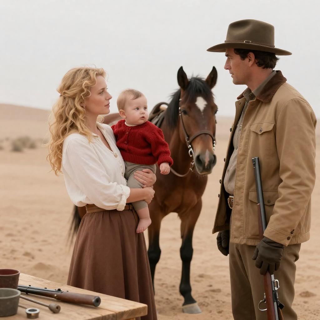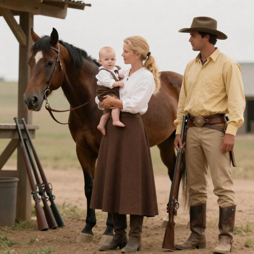 Photograph of a Western scene: a blonde woman in a white blouse and brown skirt holds a baby, standing beside a horse. A man in a brown hat, yellow shirt, and beige pants stands to the right, holding a rifle. Background includes a wooden structure and rifles leaning against it.