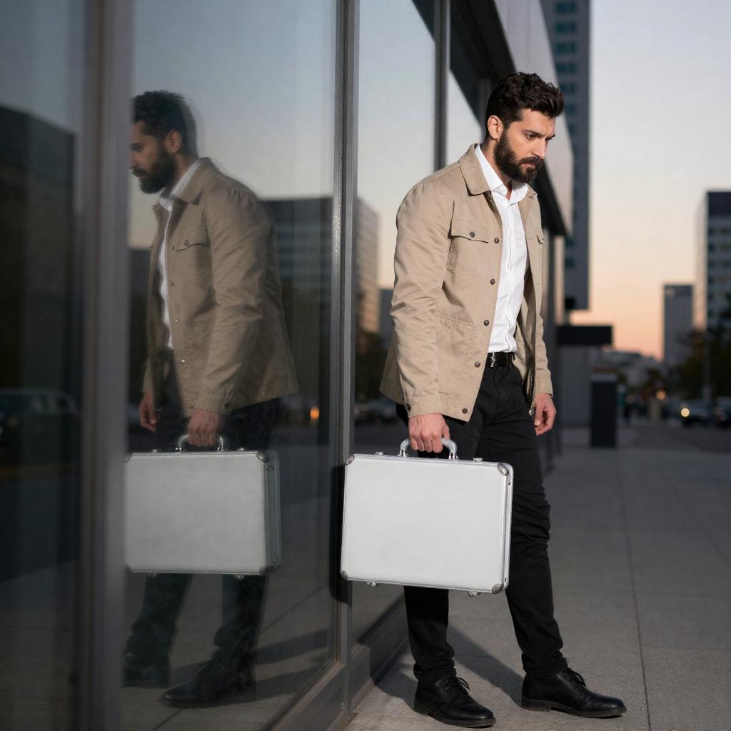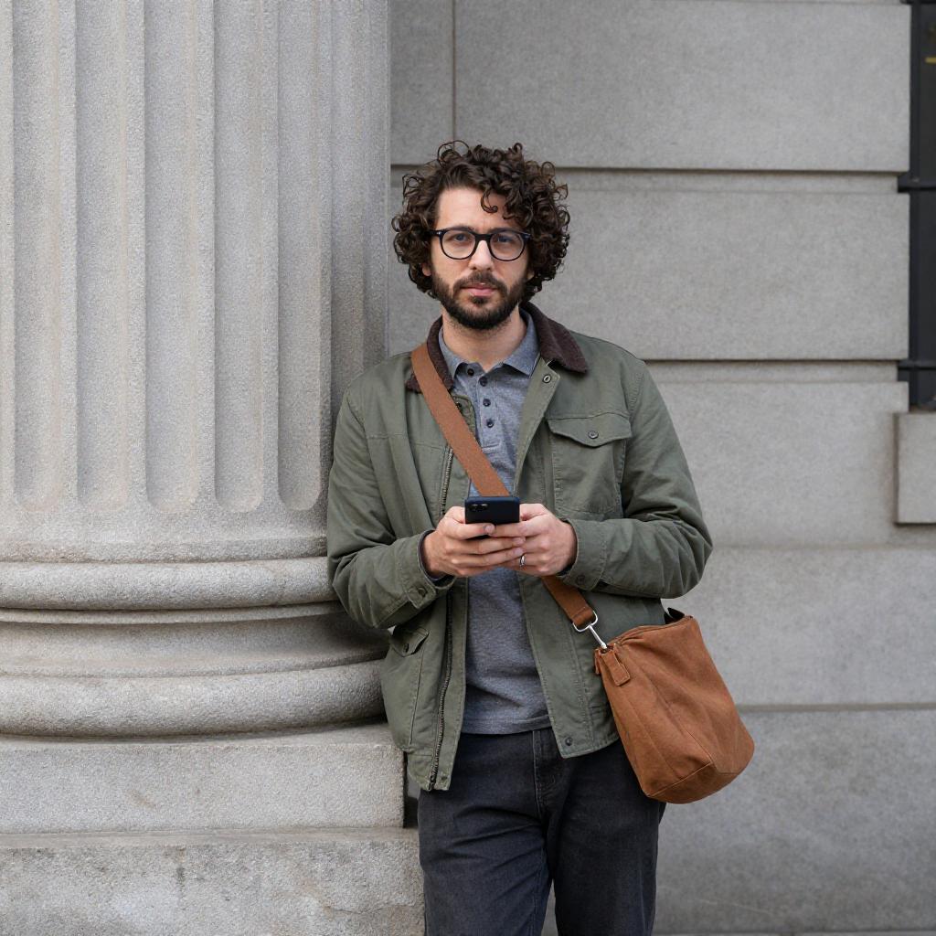 Photograph of a bearded man walking in a snowy, empty parking lot. He wears a brown corduroy jacket, dark pants, gray gloves, and a brown leather satchel over his shoulder. He holds a black umbrella in his right hand. Snow falls around him, and trees are visible in the background. His expression is serious and focused.