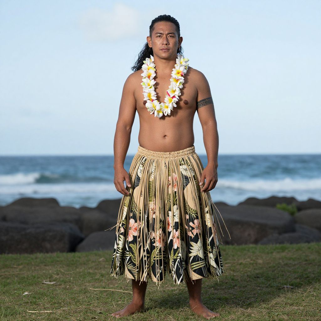 Modern Hawaiian Costume, man in a hawaiian outfit standing with a hula skirt and a flower garland