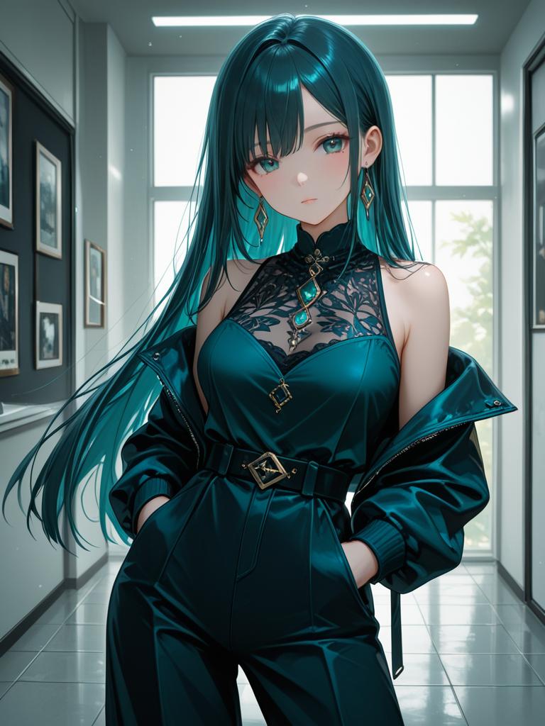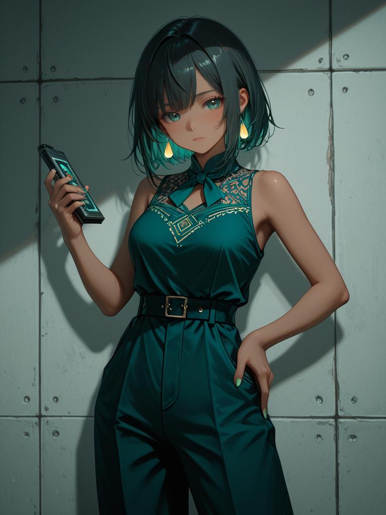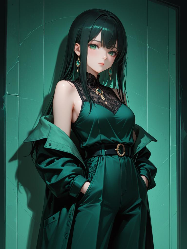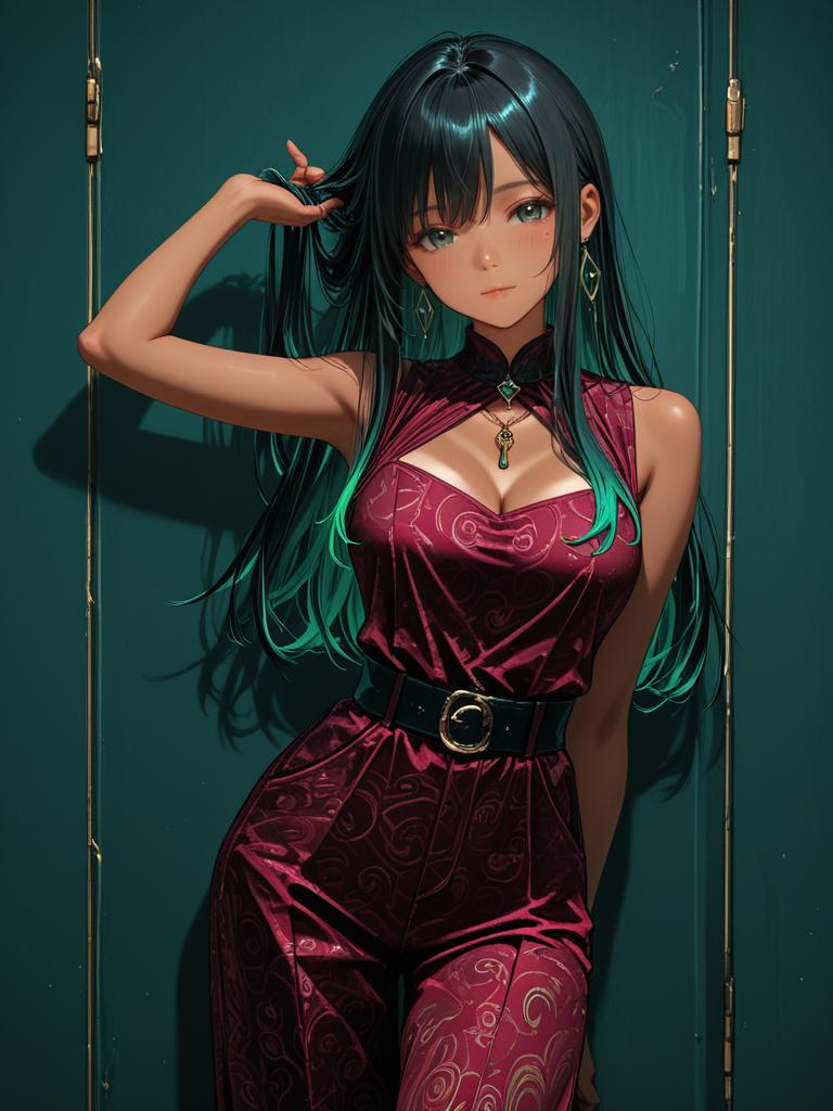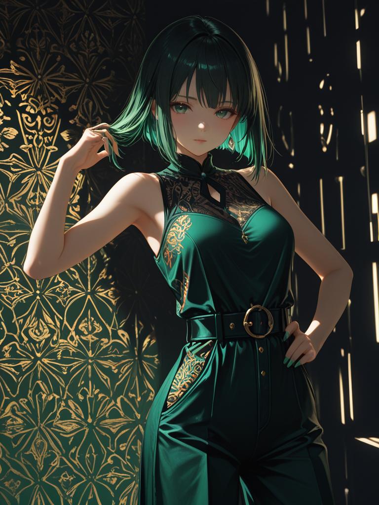 1girl, anime, woman wearing sleeveless wide-leg belted jumpsuit with wrap-front neckline and bold abstract geometric print in slate grey base with pastel geometric color pops on olive-skinned woman with long loose waves and glossy nude lip posed standing confidently with one hand on her hip and the other in her pocket in muted bottle-green wall for sophisticated mood, cool neutral studio lighting for sharp lines, modern editorial fashion photography, high resolution, ultra-detailed