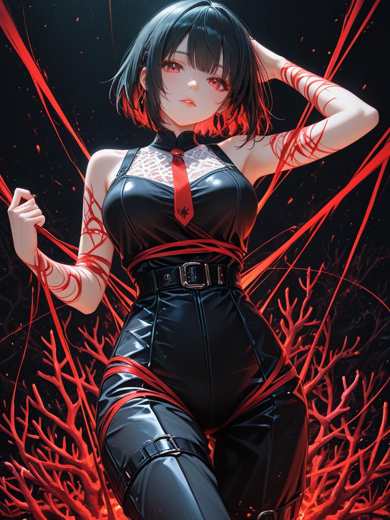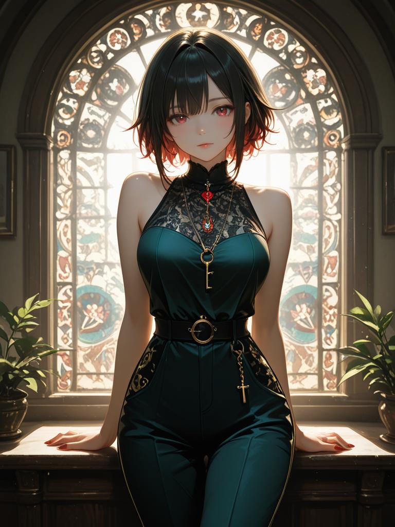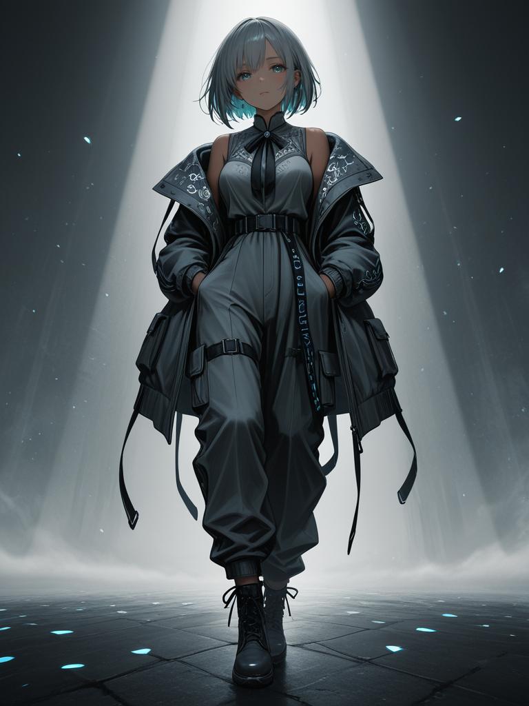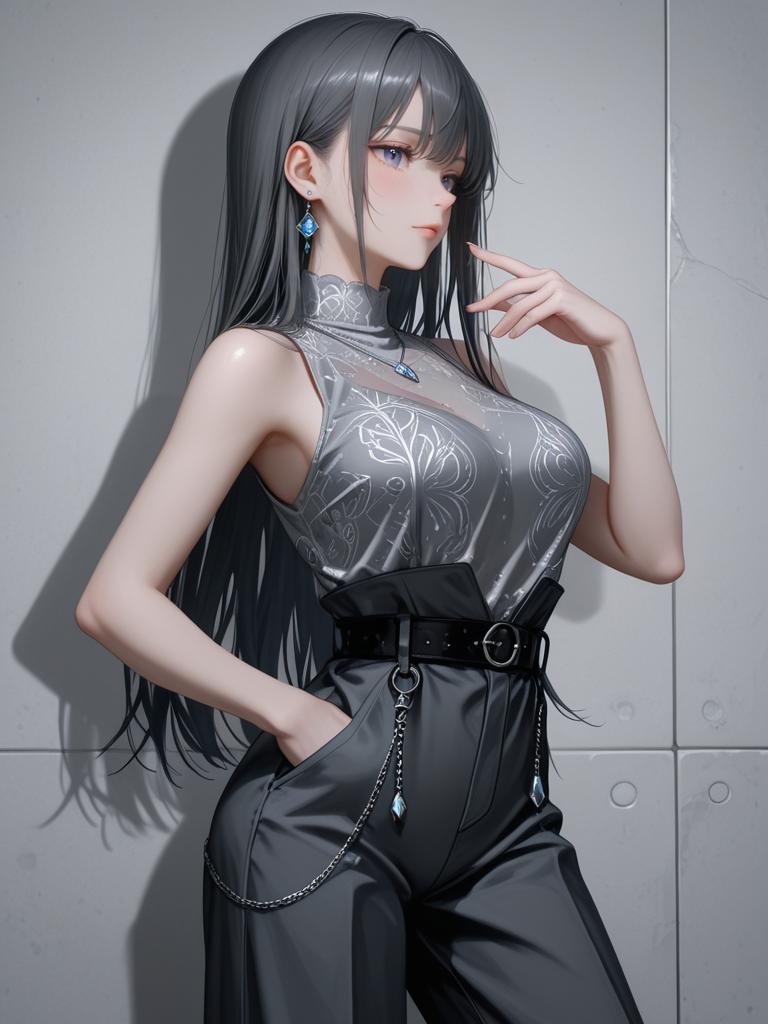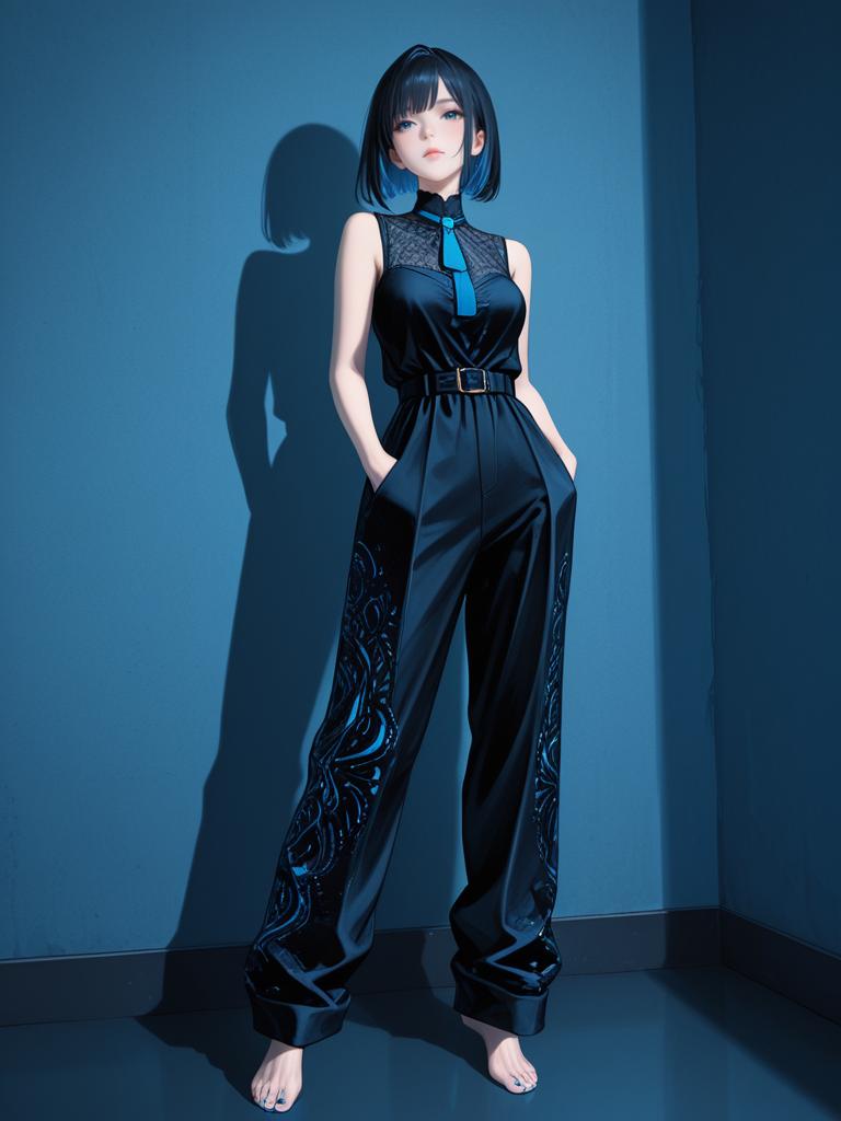1girl, anime, woman wearing sleeveless wide-leg belted jumpsuit with wrap-front neckline and bold abstract geometric print in slate grey base with pastel geometric color pops on olive-skinned woman with long loose waves and glossy nude lip posed standing confidently with one hand on her hip and the other in her pocket in muted bottle-green wall for sophisticated mood, cool neutral studio lighting for sharp lines, modern editorial fashion photography, high resolution, ultra-detailed