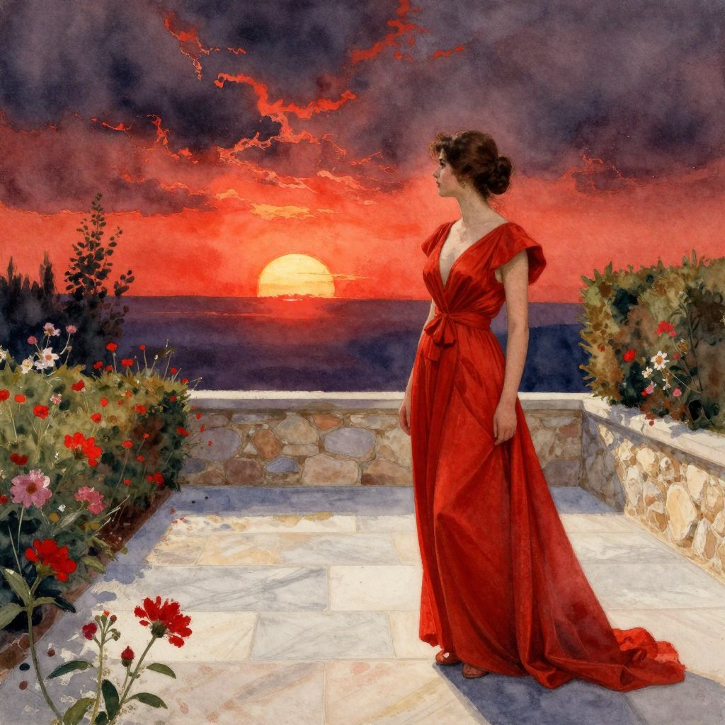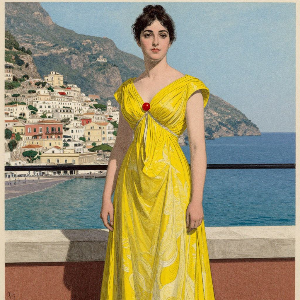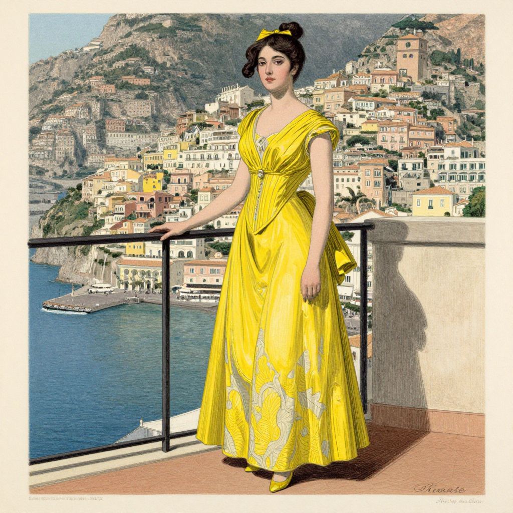 Amalfi, illustration of a woman in a yellow dress by Worth, 1922 (pochoir print)