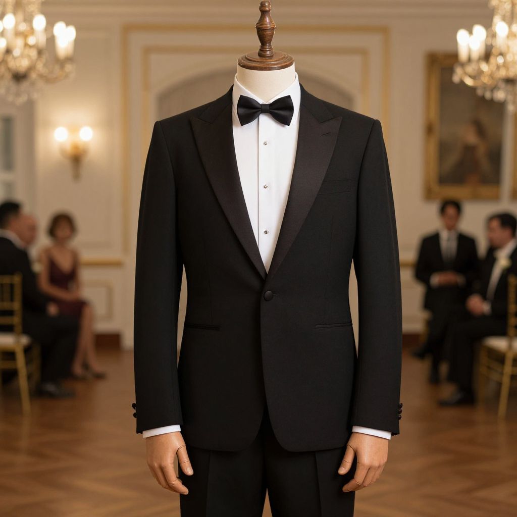 Photograph of a black tuxedo with white dress shirt and black bow tie, displayed on a mannequin in an elegant, dimly lit