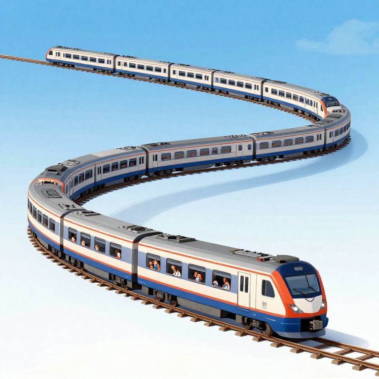 This digital illustration depicts a long, curving train with multiple connected cars, set against a clear blue sky. The train, featuring a sleek design with a white, red, and blue color scheme, is shown from an aerial perspective. The cars are uniformly arranged in a semicircular loop, with the front car facing downward to the right. Each car has large windows and a dark blue underbelly. The train tracks are visible, running parallel to the curve, and the background is a gradient of light blue sky with no additional objects or scenery. The illustration has a clean, modern, and slightly stylized aesthetic.