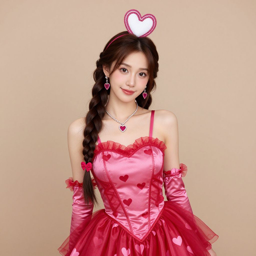 Photograph of an Asian woman with long braided brown hair, wearing a pink heart-patterned corset dress, matching gloves, heart-shaped headpiece