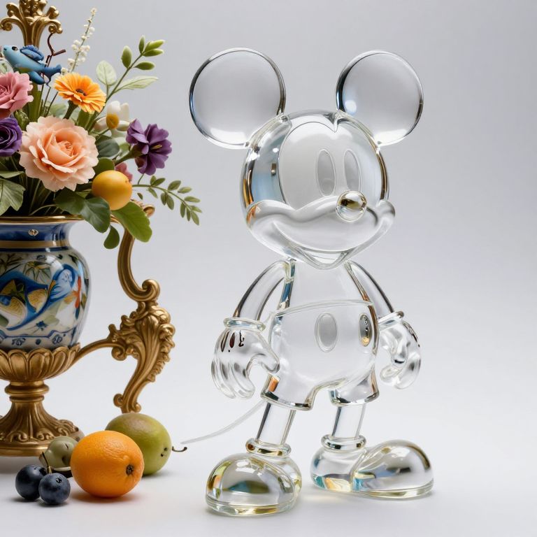 Visual Effects a transparent mickey mouse sculpture made by glass next to a baroque stillife with flowers, fruits and fish,