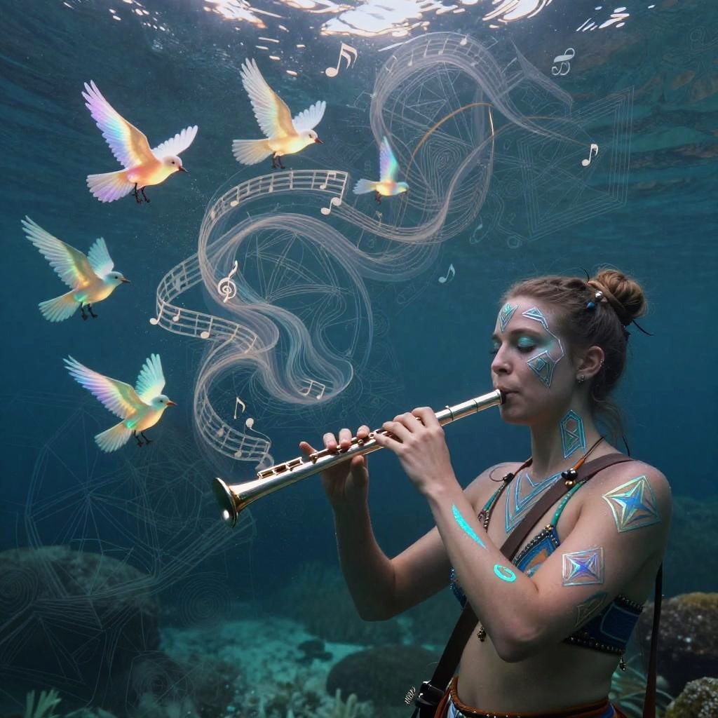 A nonbinary street musician with iridescent skin, geometric facial markings, and a glass flute on a psychedelic journey, witnessing herself unraveling into swirling ribbons of musical notes that solidify into living, luminescent birds, submerged in a vast chaotic ocean of intricate geometric designs. She merges with the water, experiencing unity with the universe, perceiving existence from countless viewpoints.