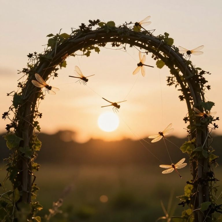Photograph of a rustic, wooden arch adorned with green moss and delicate, translucent dragonflies with orange-tipped wings. The arch is positioned in a sunlit meadow at sunset, with a bright, golden-orange sky in the background. The ground is covered in small rocks and patches of grass. The dragonflies are perched on the arch and surrounding foliage, casting gentle shadows. The image has a soft, warm glow, highlighting the natural beauty and intricate details of the arch and insects. The background is slightly blurred, emphasizing the arch and dragonflies in the foreground.