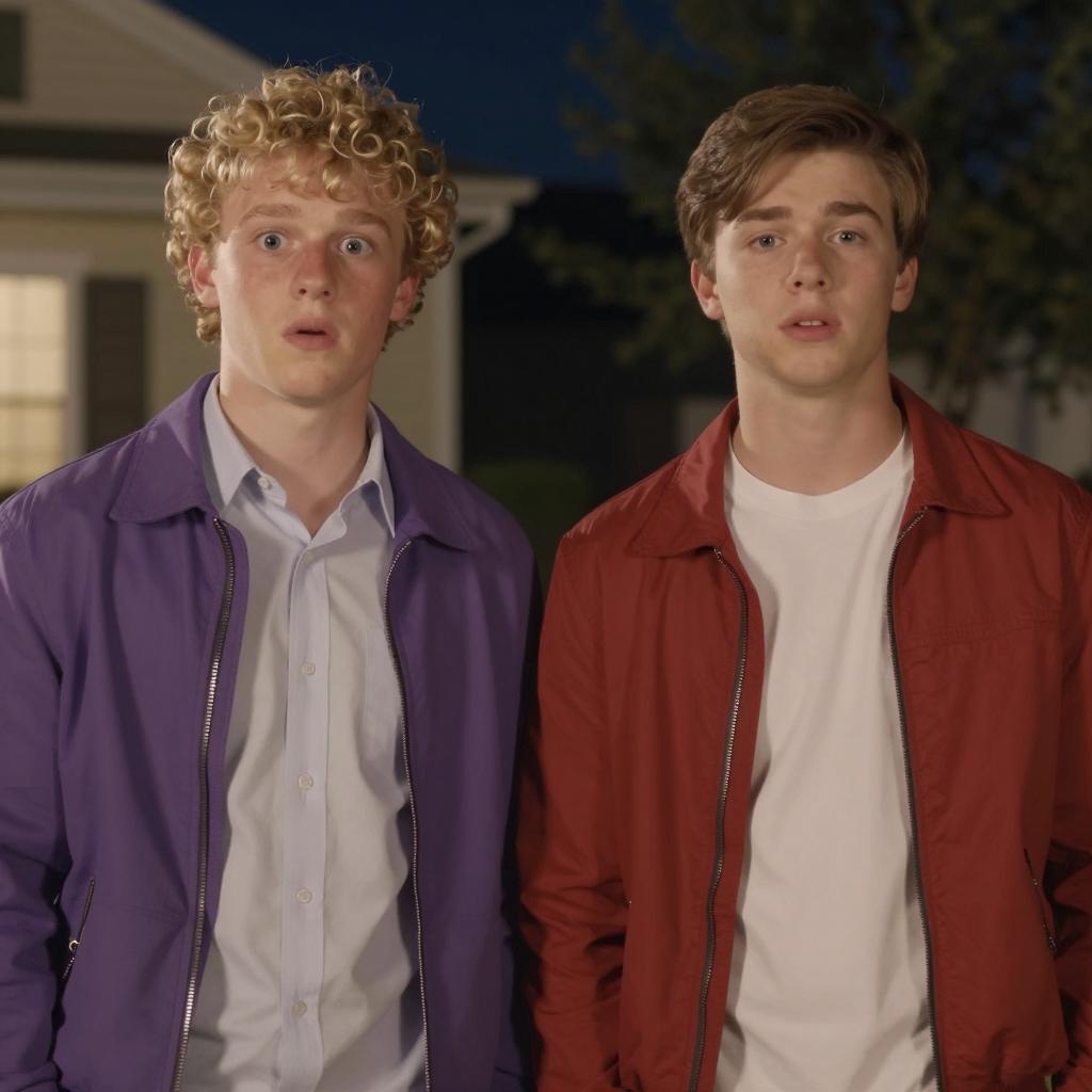 Two young boys with light brown hair and glasses, wearing brown and beige varsity jackets over white sweaters, stand in a suburban backyard. The boy on the left has his hands in his jacket pockets, while the boy on the right stands with his hands down. A tree is in the background, with a brick building and tools on the left. Both boys have neutral expressions.
