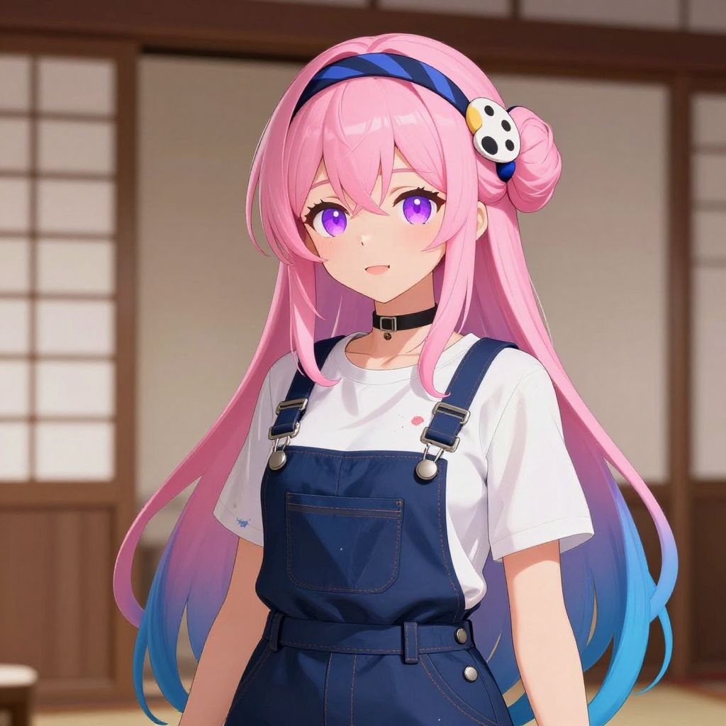 This digital anime-style illustration features a young girl with long, pastel pink hair that fades into blue at the tips. She has large, purple eyes and wears a black choker. Her hair is adorned with a blue headband and a small, white skull-shaped hairpin. She is dressed in a white t-shirt under navy blue denim overalls, with silver buttons. The background shows a traditional Japanese room with wooden sliding doors and a shoji screen. The girl's expression is gentle, and she stands slightly off-center in the foreground, with the background softly blurred. The overall color palette is soft and pastel-like.