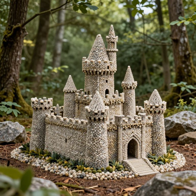 A miniature castle made of pebbles is nestled in a forest, surrounded by trees and rocks.