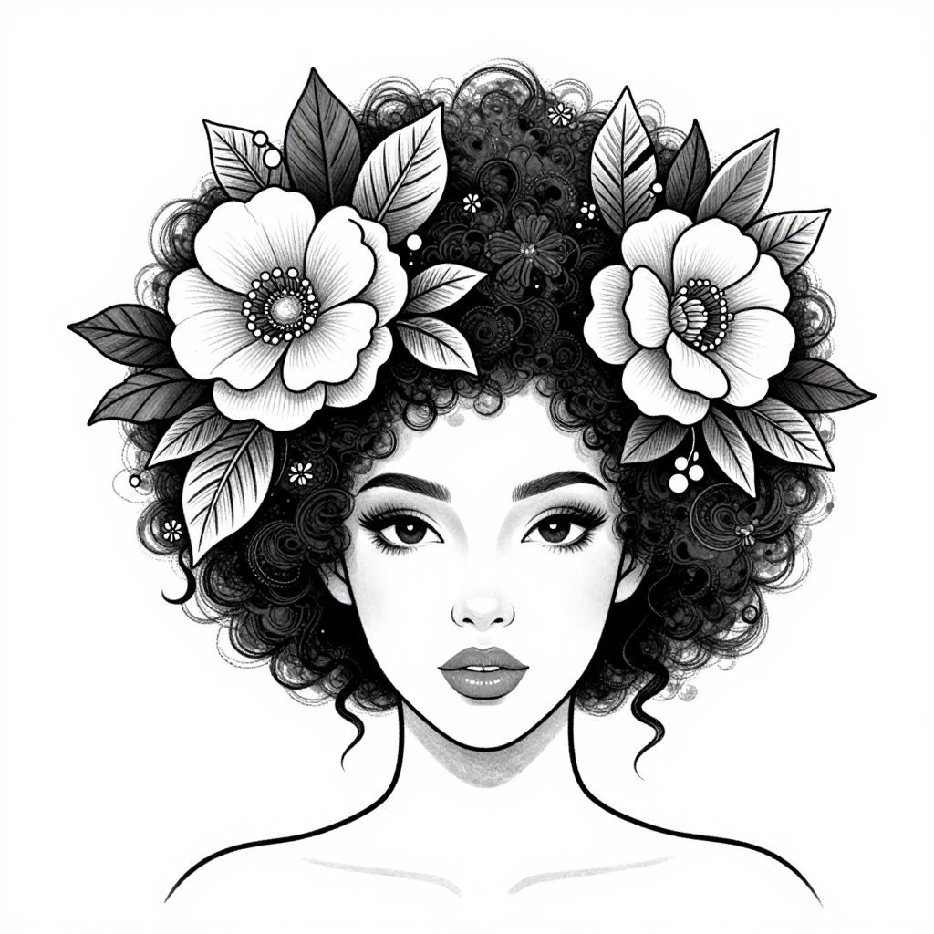 Profile portrait of a serene woman adorned with a vibrant floral crown, featuring intricate patterns and colorful details, showcased on Johanna Basford's coloring gallery.
