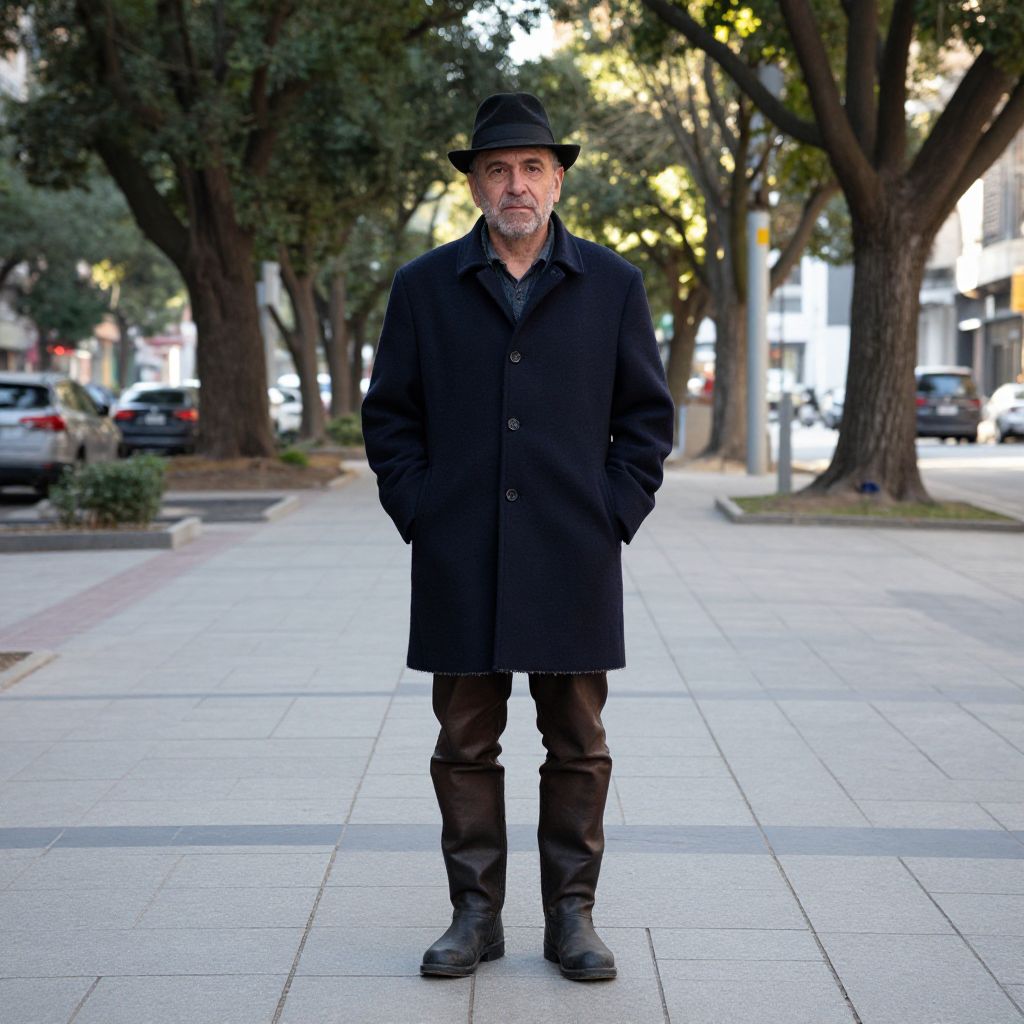 A middle-aged man with a strong, weathered face, short gray beard, and kind eyes stands confidently on a paved city street. He wears a black fedora hat, a dark navy wool coat with a slight frayed hem, brown leather pants, and sturdy black boots. The surface is a quiet, well-maintained sidewalk under soft afternoon sunlight. In the background, tall, dense trees with broad canopies stretch into the distance, their leaves filtering the sunlight into dappled patterns. The scene has a calm, slightly nostalgic atmosphere, suggesting a moment of quiet reflection in an urban environment.