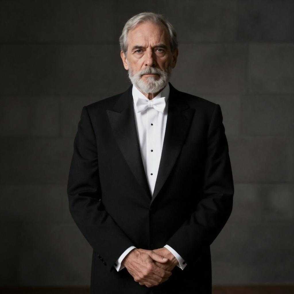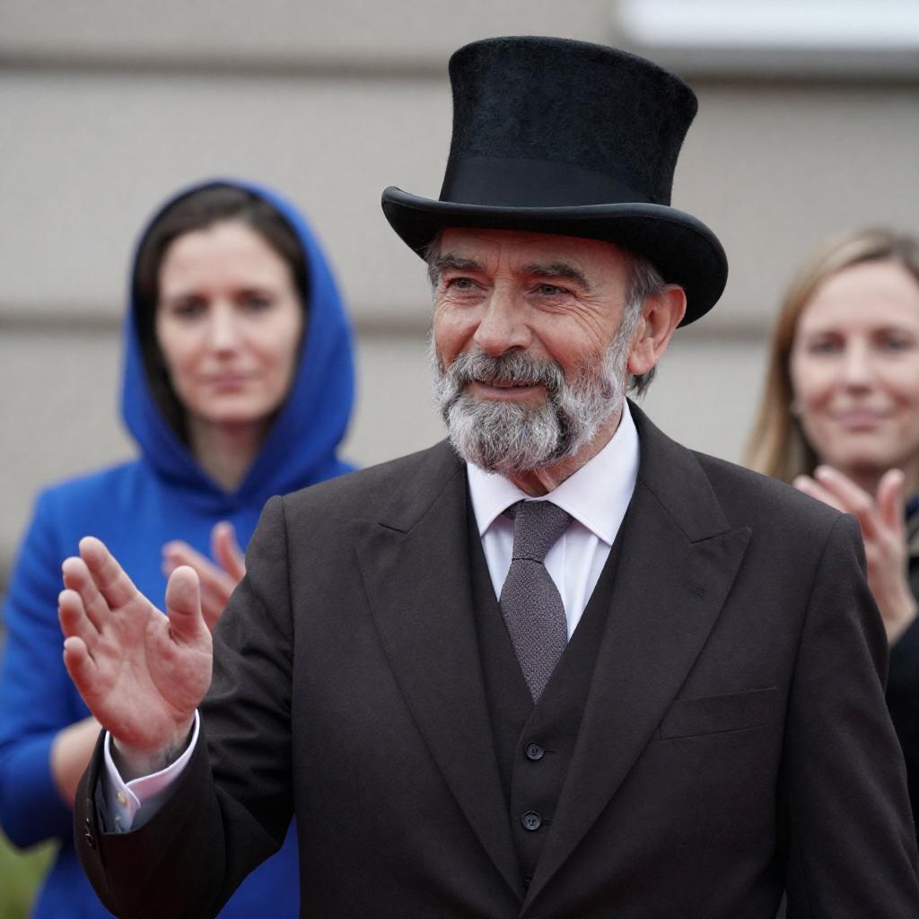 Photograph of an older man with a gray beard and mustache, wearing a black hat and coat, singing into a microphone. He stands in front of a brightly lit, colorful carousel with yellow and red details. The low-angle shot emphasizes his expressive face and the vibrant background.