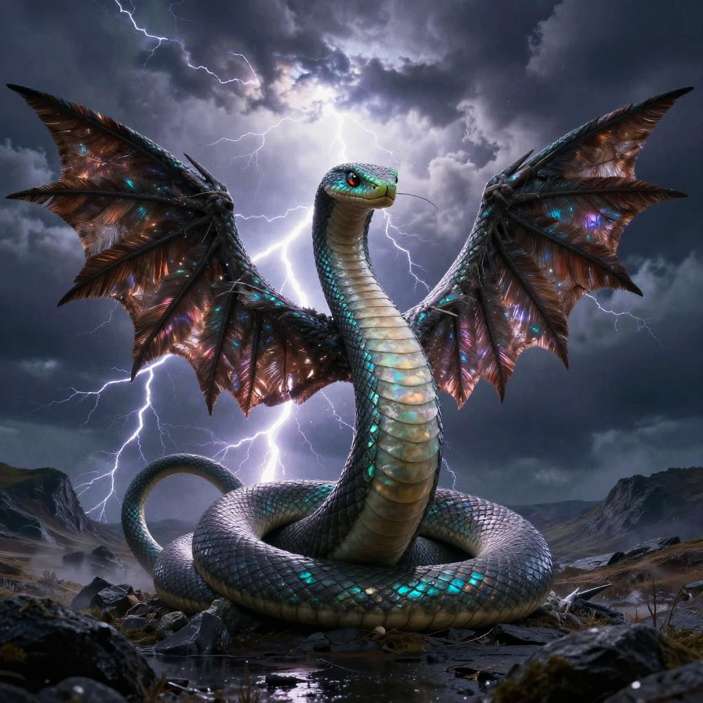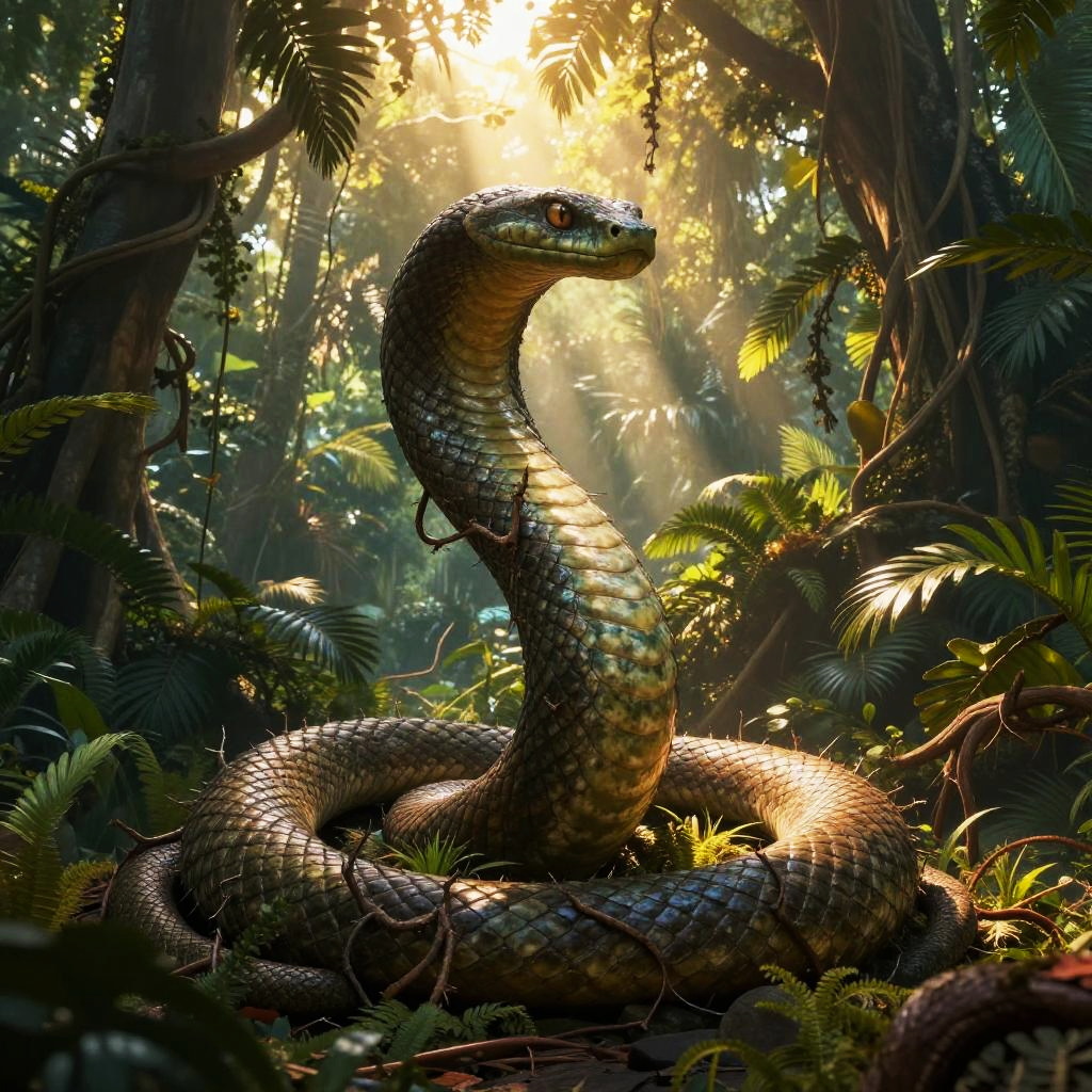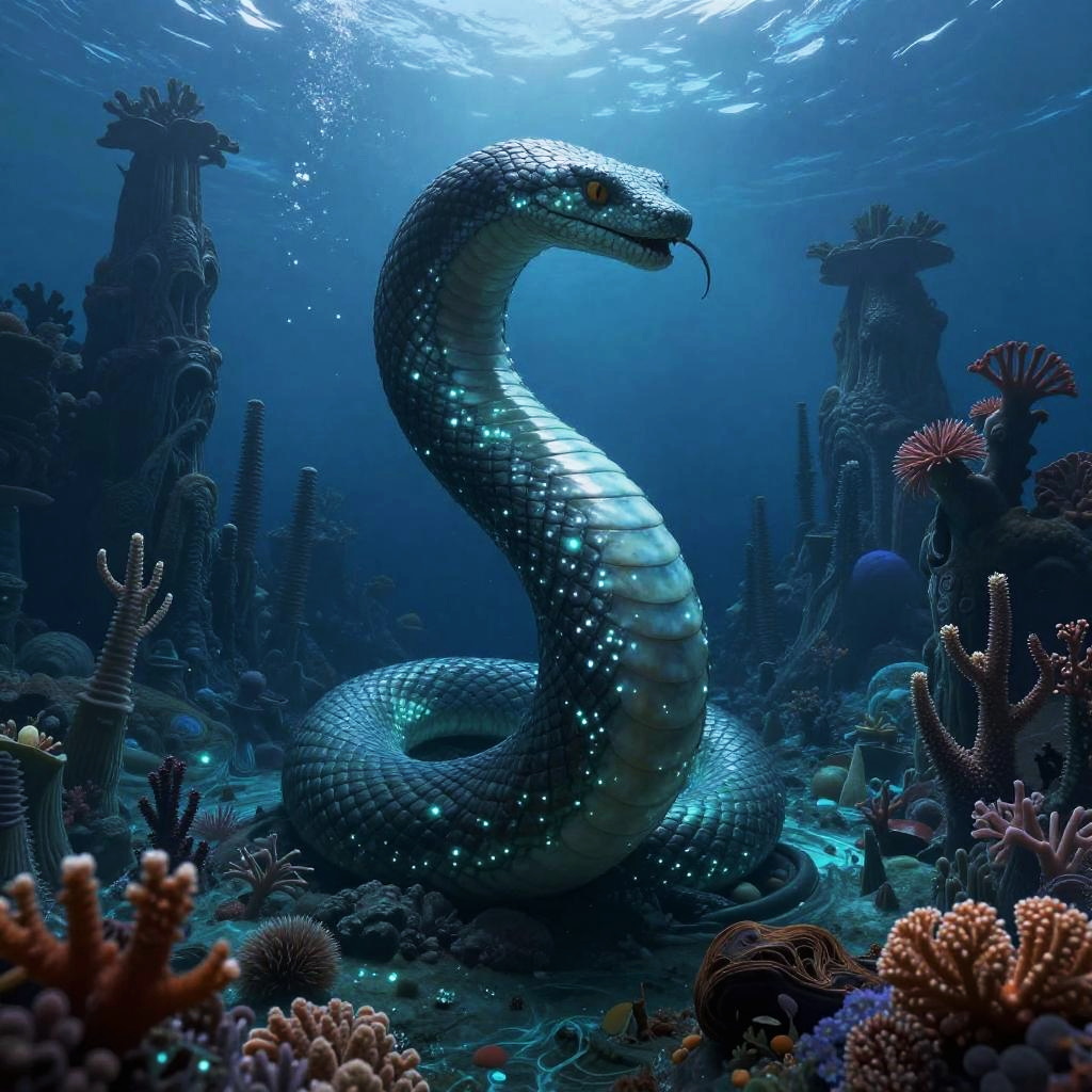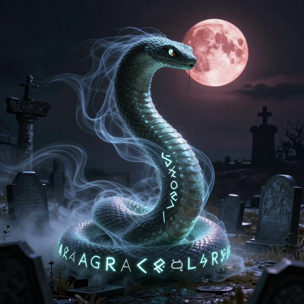 Jörmungandr – The world serpent, enemy of Thor, shown as a luminescent serpentine shadow wrapped in ethereal wisps and glowing runes, set in an ancient cemetery under a blood moon, scattered tombstones cloaked in spectral fog.