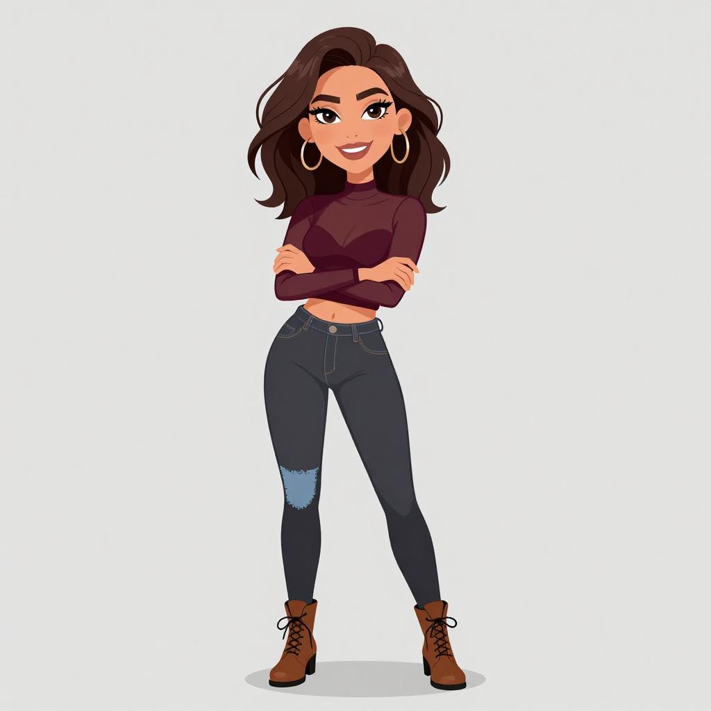 Digital illustration of a smiling woman with long black hair, wearing a pink halter top, blue jeans, black belt with gold buckle, and brown ankle