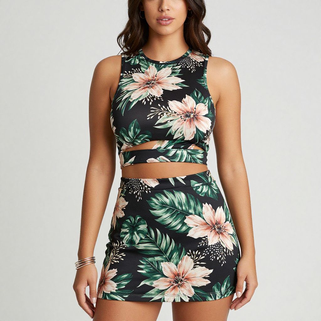 "Woman, trendy fashion, floral print two-piece set, high neckline, sleeveless crop top, cut-out detail at waist, coordinating mini skirt, green leaf and pink floral patterns on a black background, bangles on one arm.. Sexy. Pretty face and beаutiful eyes. Big breasts."