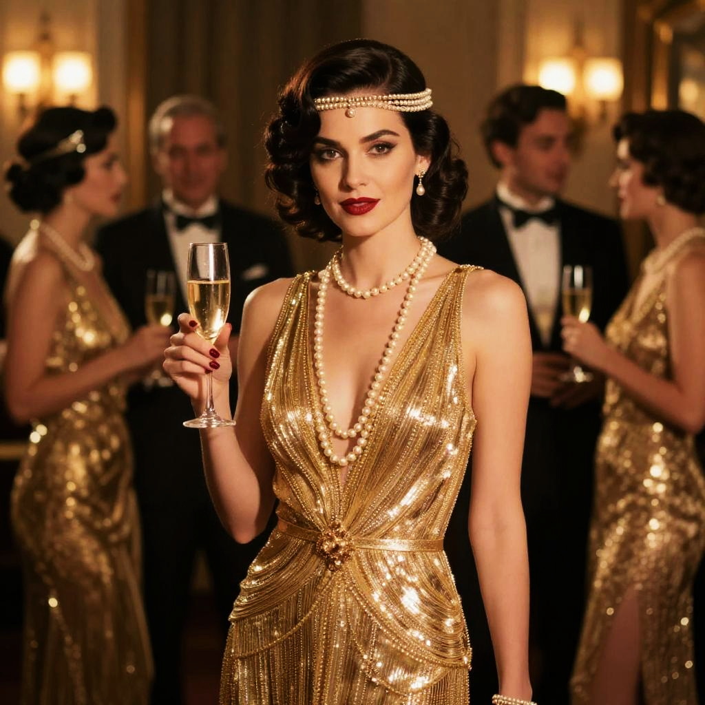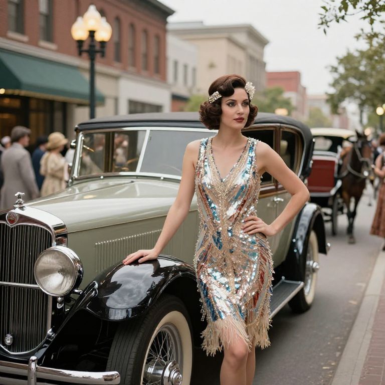 Retro vintage flapper in a 1920s bobbed hairstyle, wearing a sequined dress, standing beside a gleaming Packard car in a 1920s urban street scene, complete with streetlamps, horse-drawn carriages, and a bustling crowd in period attire.