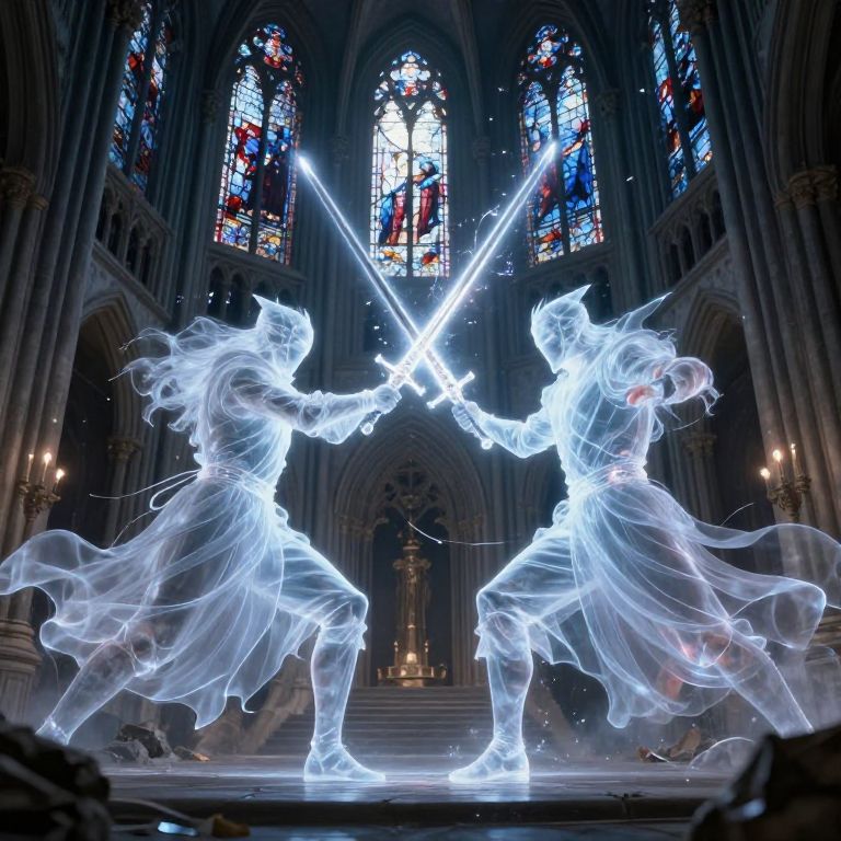 Photograph of a luminous, ethereal light sculpture in a grand, gothic cathedral. Two translucent, ghostly figures, resembling knights, face each other with glowing white swords crossed. The figures have flowing, mist-like robes and are illuminated from within. The background features tall, dark stone columns, ornate arches, and vibrant stained glass windows with red, blue, and green hues. Candlelight flickers in the distance, adding warmth to the cool, glowing light of the sculpture. The scene evokes a mystical, almost otherworldly atmosphere within the historic, sacred space.