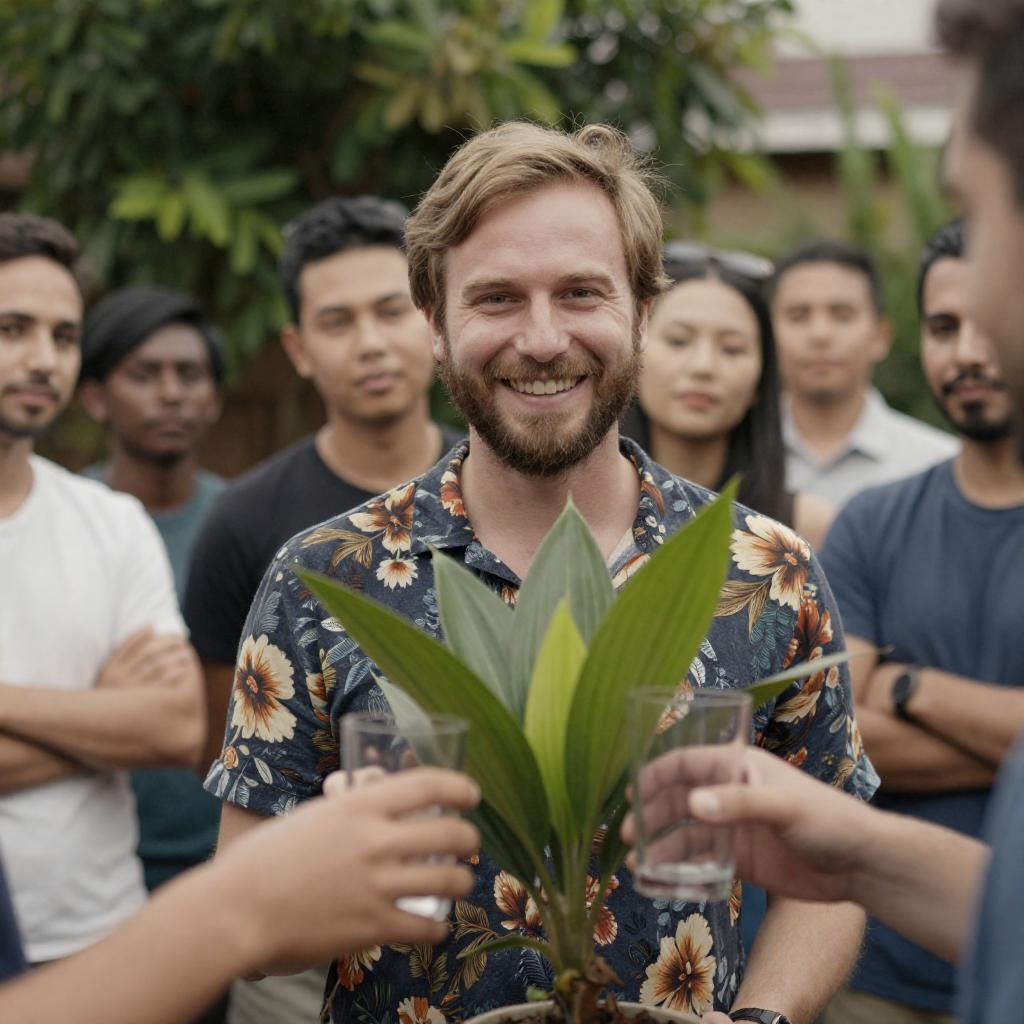 Photograph of a man with light brown hair and beard, wearing a floral shirt, holding two glasses, smiling. He's in front of a green plant, surrounded by six people. Background includes greenery and people in casual attire.