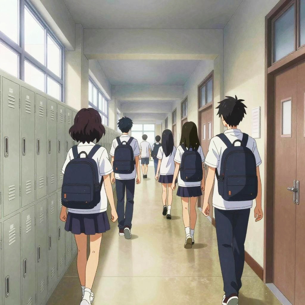 School hallway anime with a focus on depth and perspective, long corridor lined with lockers and doors, students walking in groups, vibrant colors and sharp details, slightly exaggerated anime style