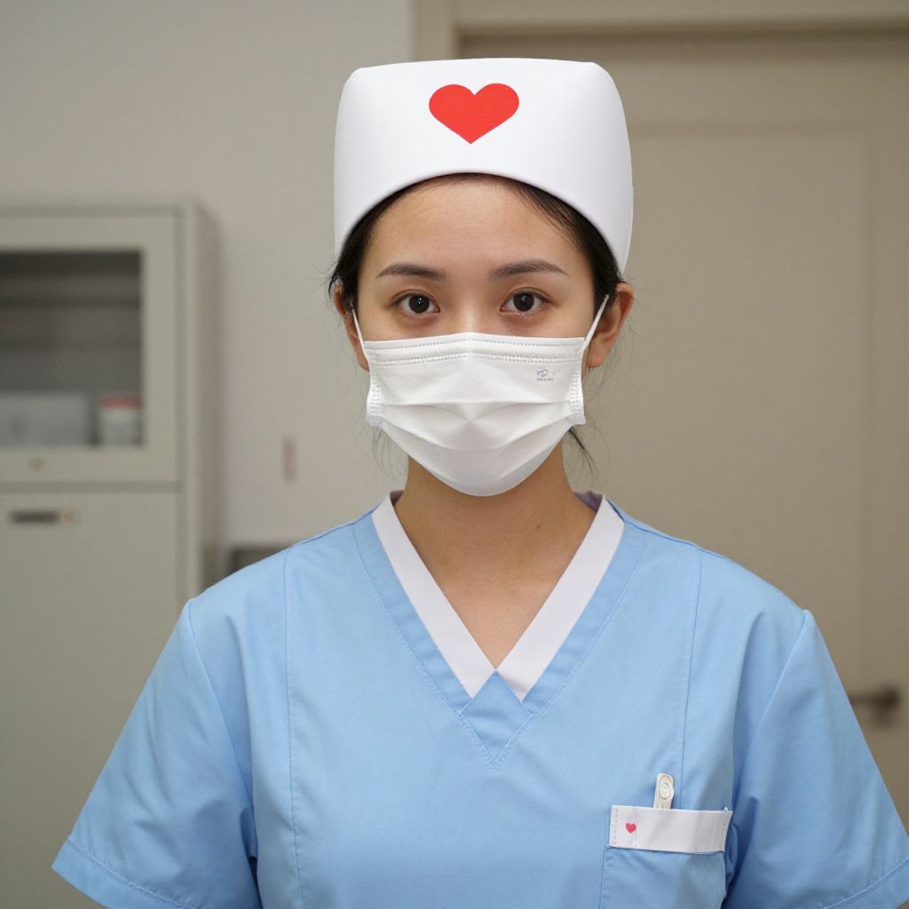 "Woman Pulse Nurse, woman in scrubs and a hat with a heart on her lap"