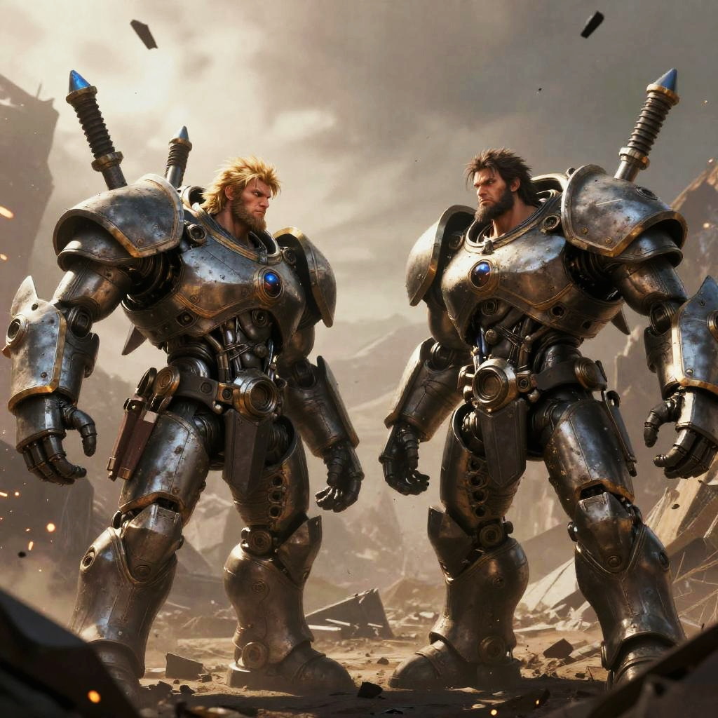 Digital artwork of two muscular, bearded men in massive, silver, armor suits with blue accents, standing in a sunlit, ruined, debris-filled