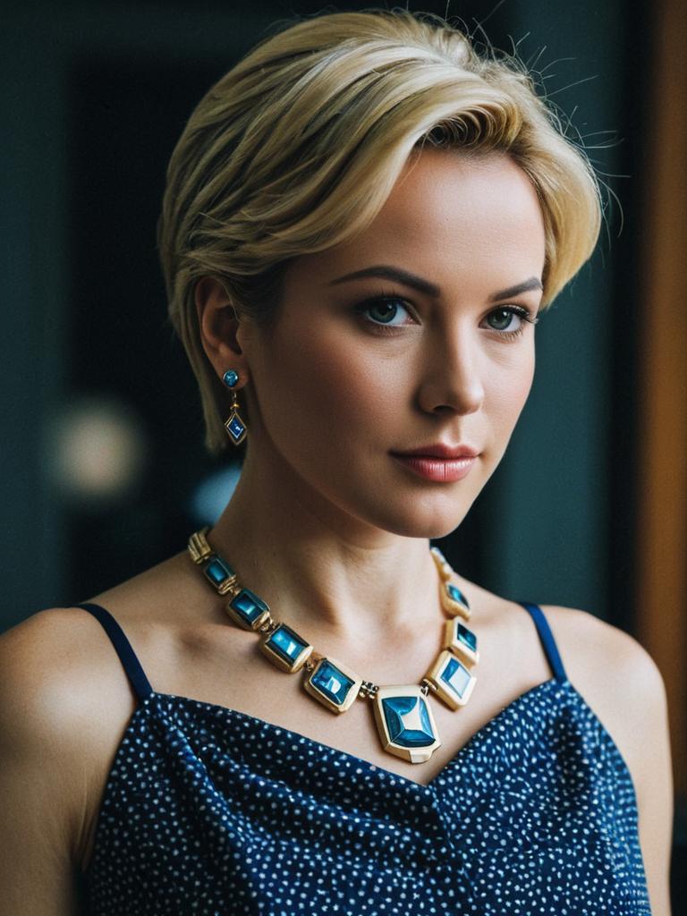 Tony stark hairstyle, jewelry, 1girl, solo, earrings, blonde hair, necklace, realistic, blue eyes, short hair, portrait, dress, lips