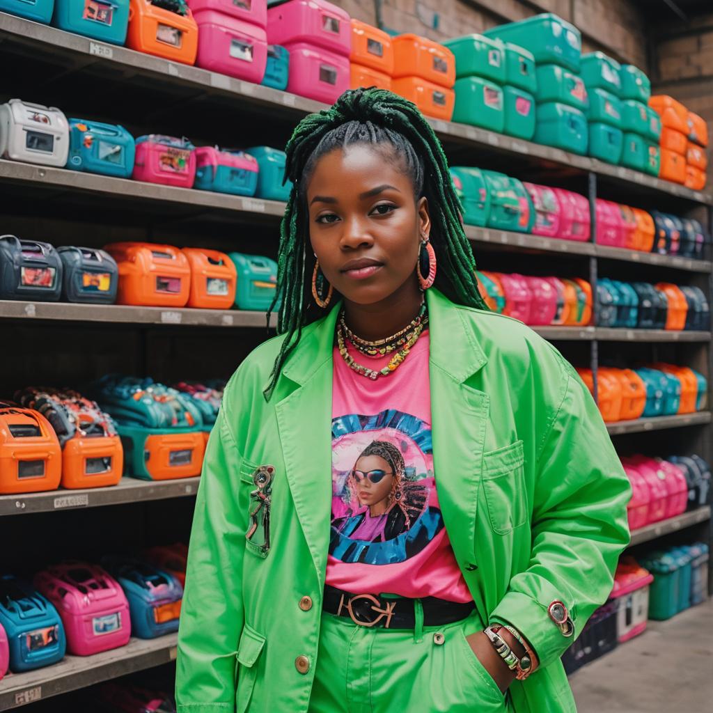 Photo of a Curvy woman, Beaded Braids, 80s theme outfit, neon colors with an oversized Viridian blazer, shoulder pads, acid-wash cargo pants, vibrant graphic tees, high-top combat sneakers, retro accessories, industrial warehouse, neon burst